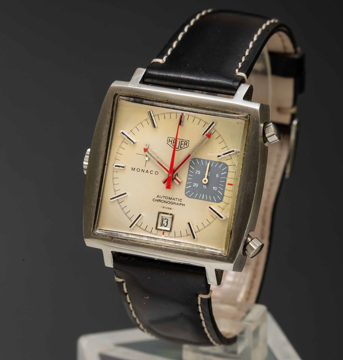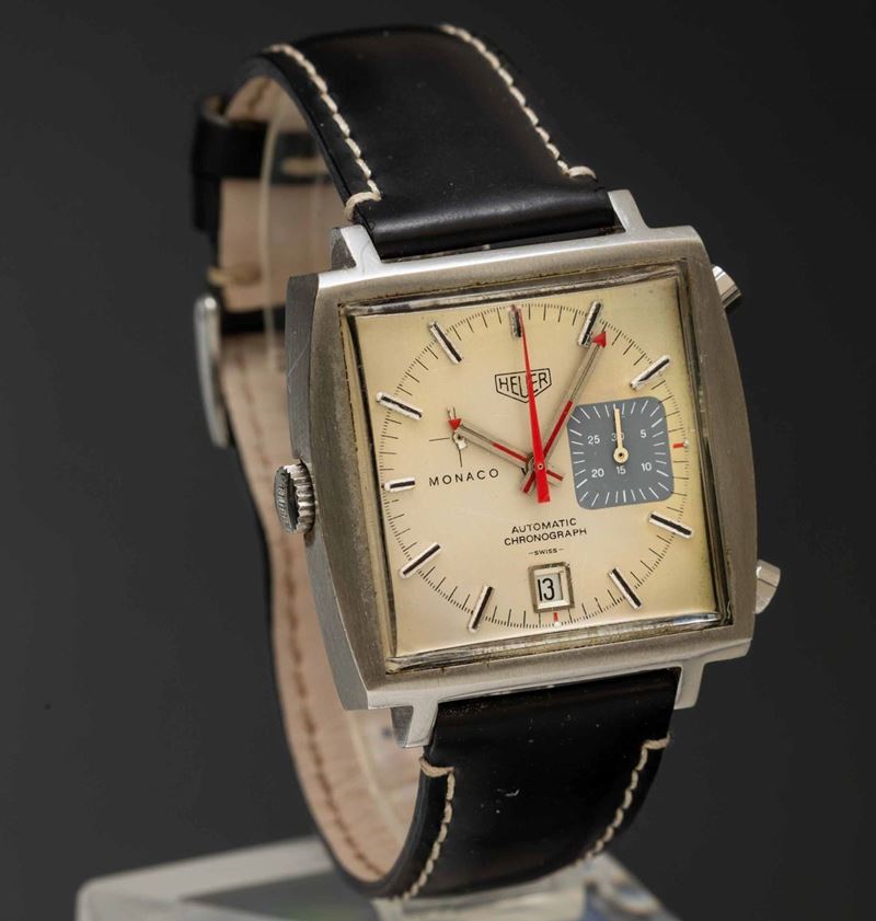 HEUER - Monaco ref 1133 cronografo automatico in acciaio di forma con datario, singolo contatore alle 3, quadrante Argent [..]