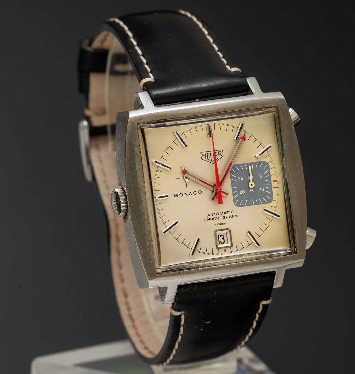 HEUER - Monaco ref 1133 cronografo automatico in acciaio di forma con datario, singolo contatore alle 3, quadrante Argentè
