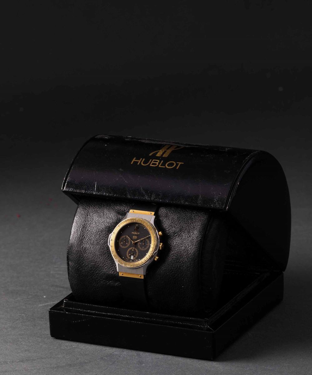 HUBLOT - MDM Cronografo in acciaio e oro al quarzo con datario, quadrante nero tre contatori e cinturino in gomma e chiusura [..]