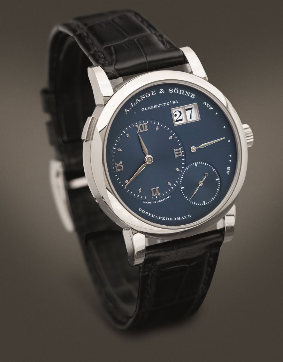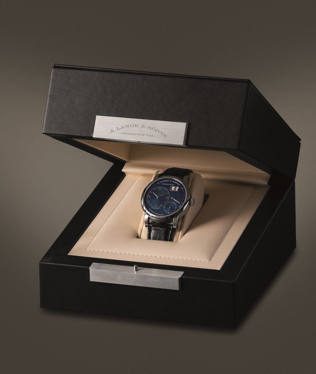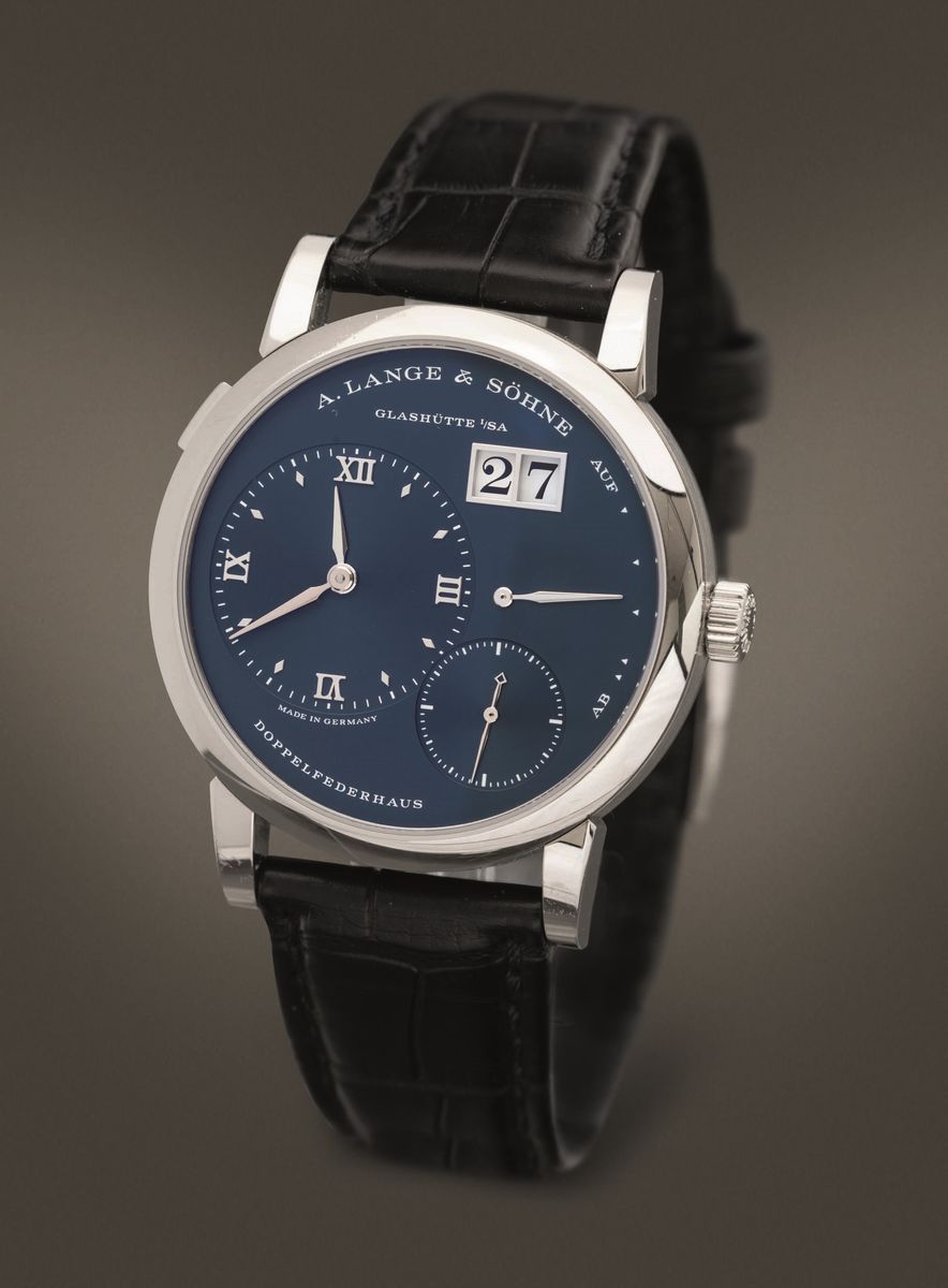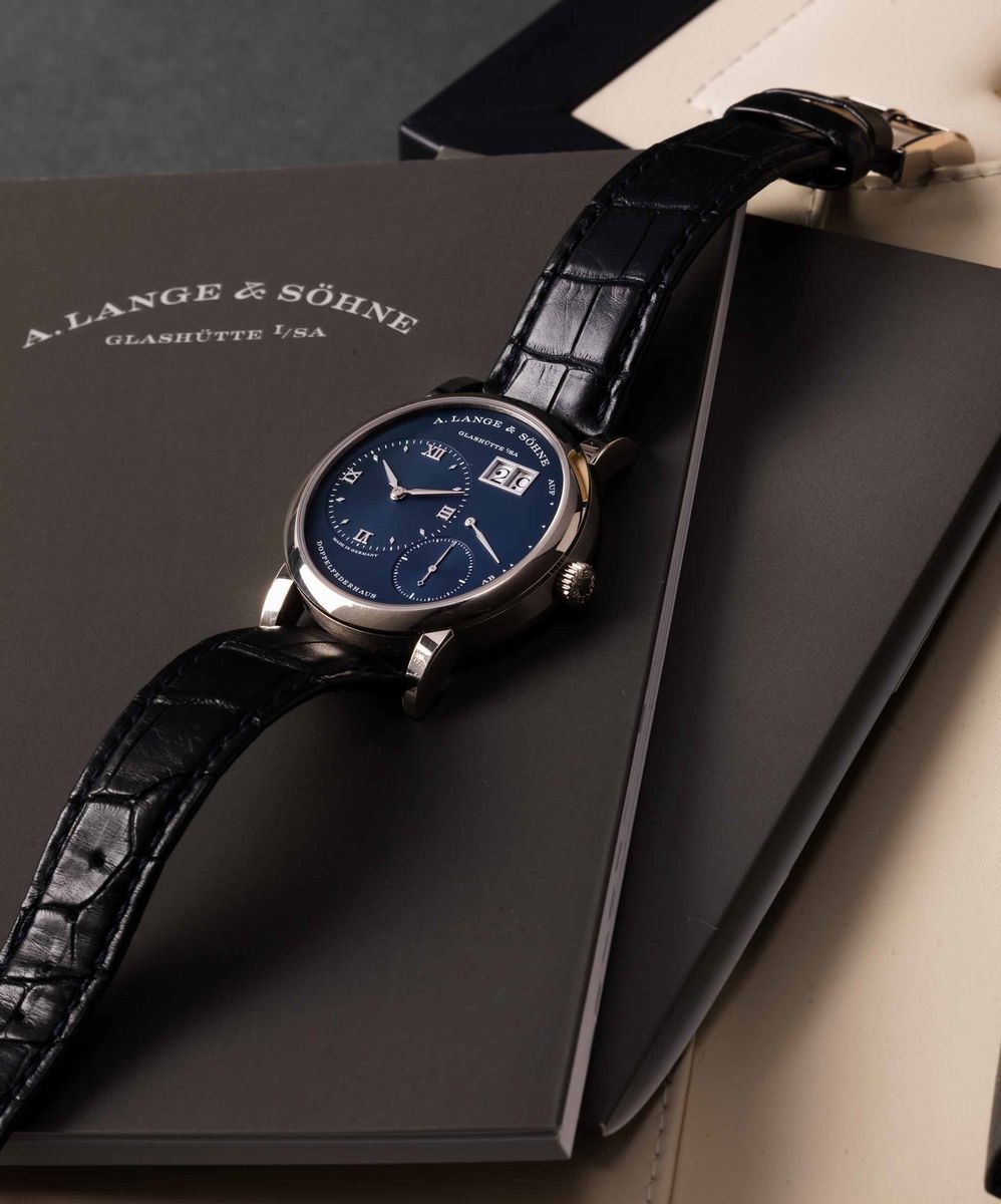 LANGE & SOHNE - Lange 1 ref 191.028 in oro bianco carica manuale con fondello a vista, datario e indicazione della riserva di carica e piccoli secondi con raro quadrante blu.