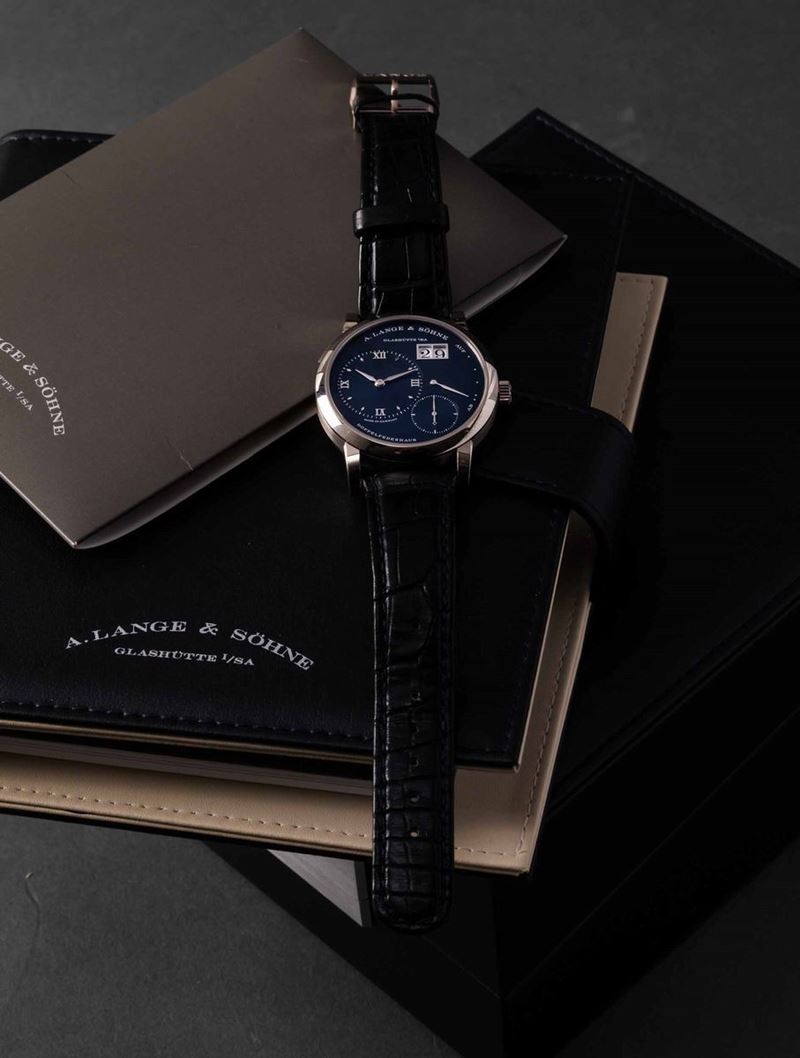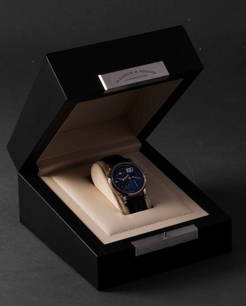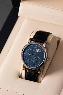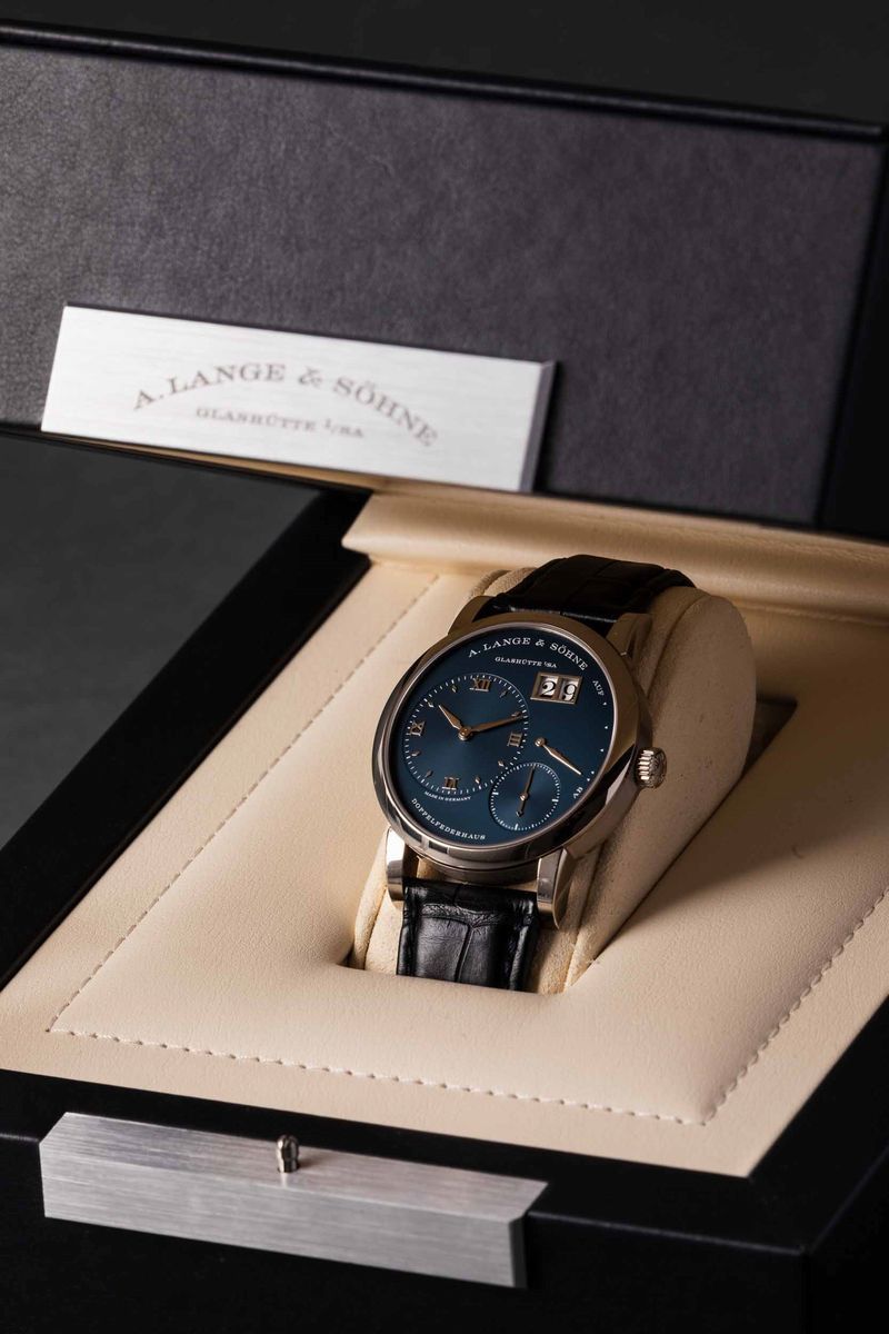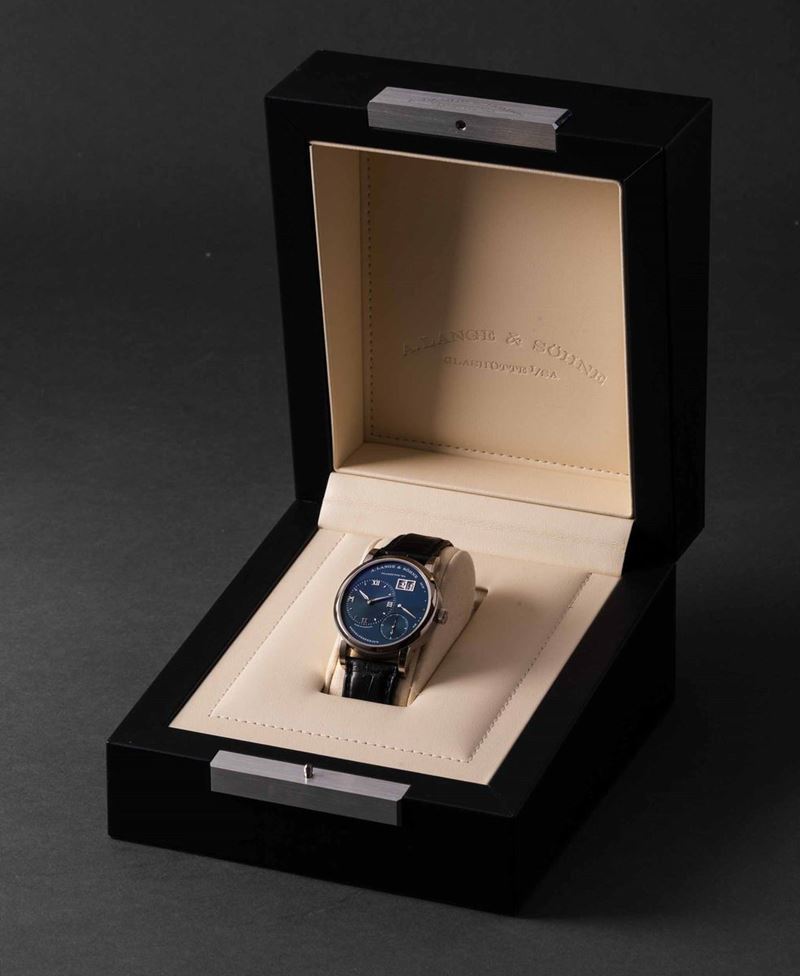 LANGE & SOHNE - Lange 1 ref 191.028 in oro bianco carica manuale con fondello a vista, datario e indicazione della riserva di carica e piccoli secondi con raro quadrante blu.