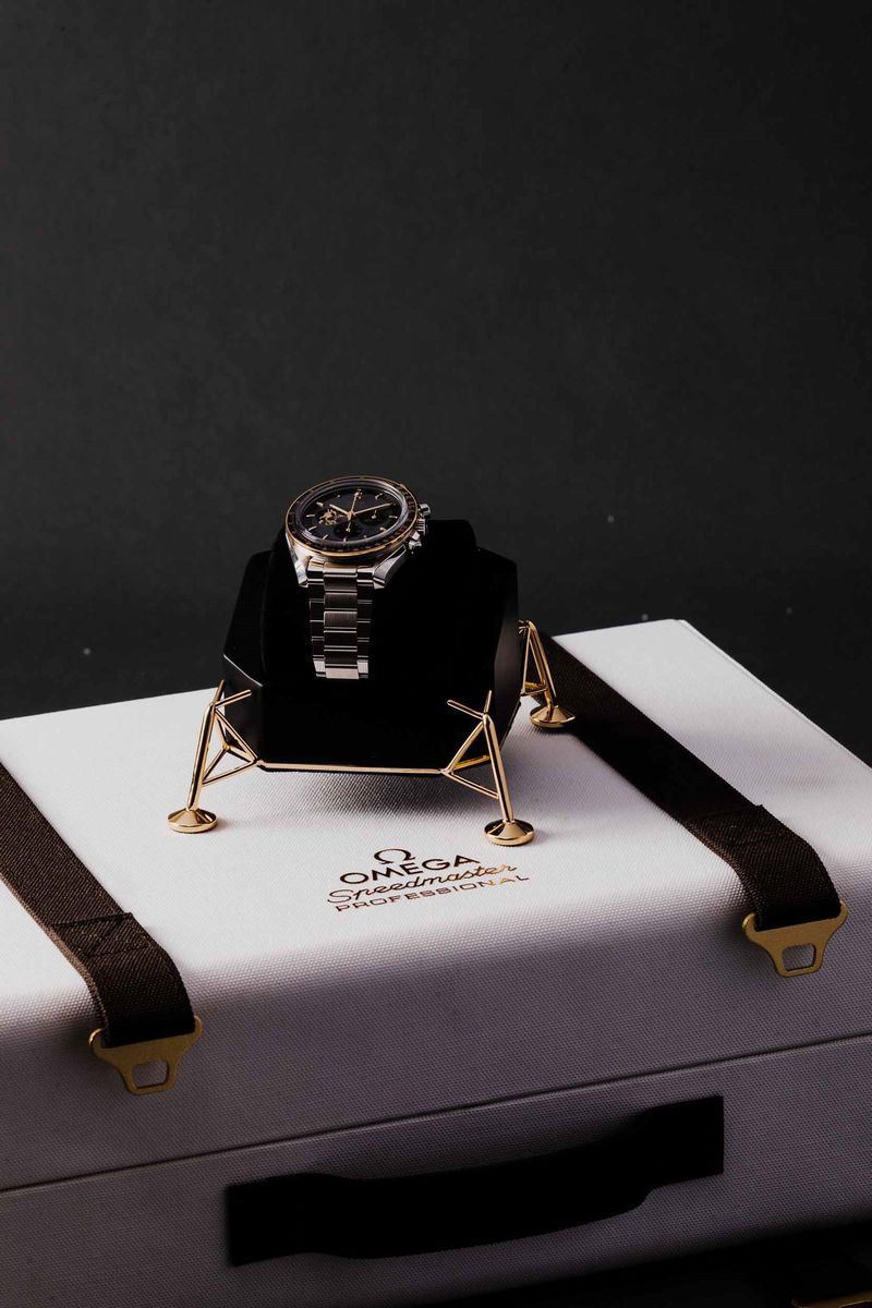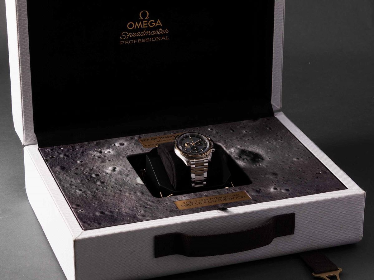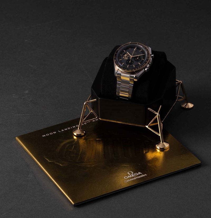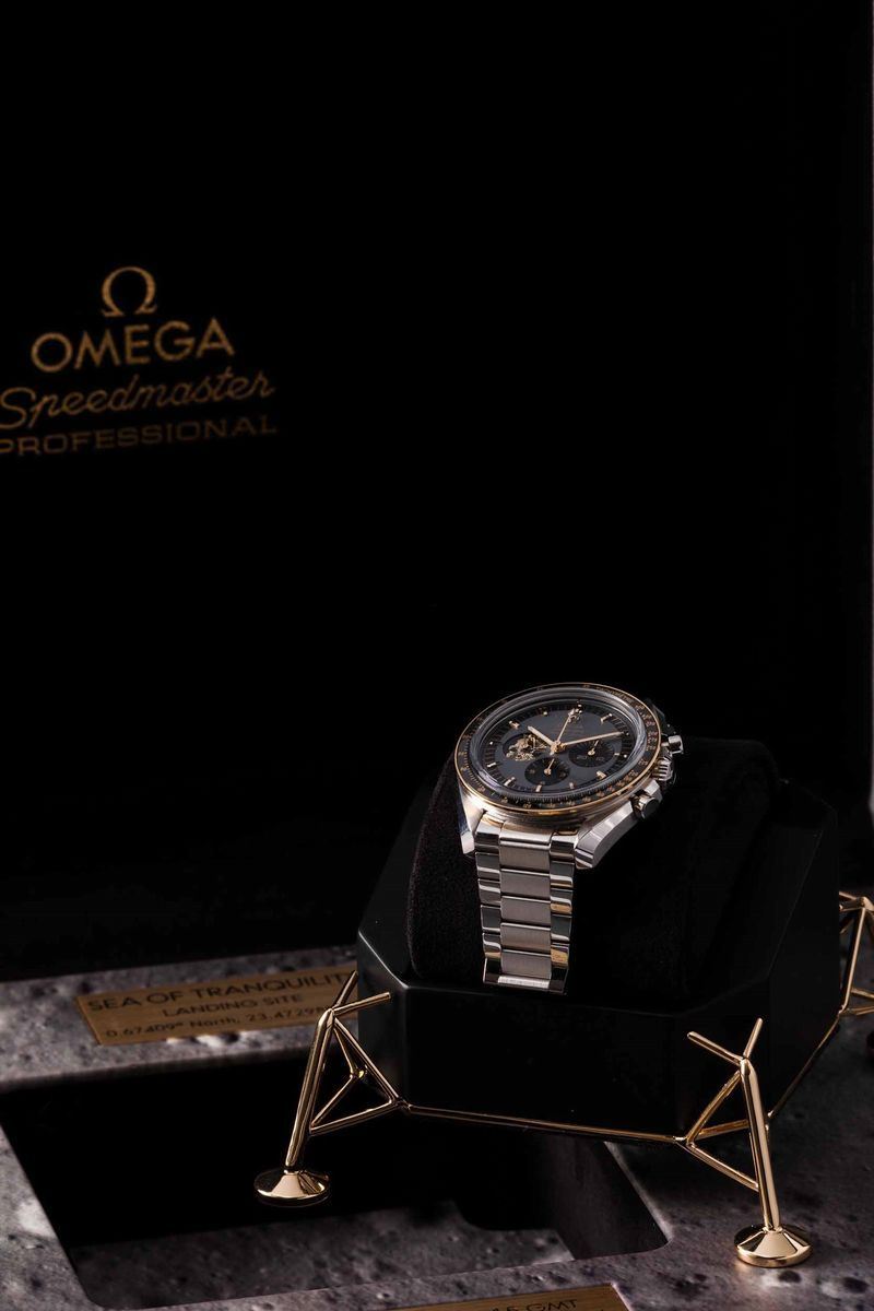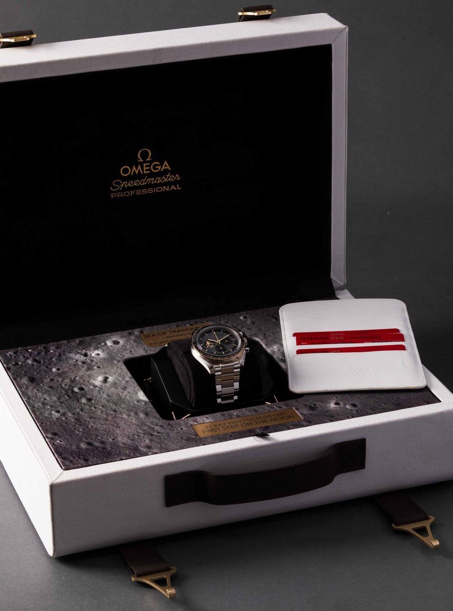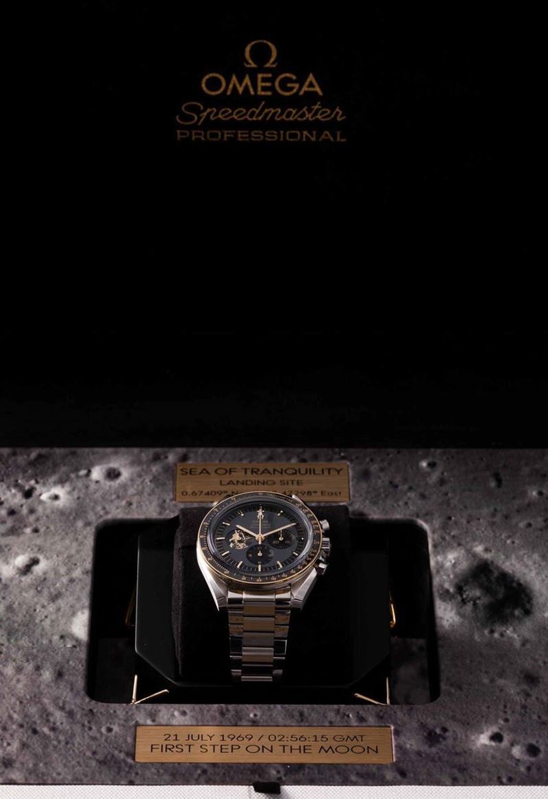 OMEGA - Speedmaster Moonwatch Apollo 11, 50° anniversario, cronografo carica manuale in acciaio con inserti in oro giallo. Edizione limitata a 6969 esemplari in memoria dello sbarco sulla luna del 1969. Accompagnato da scatola originale e garanzia