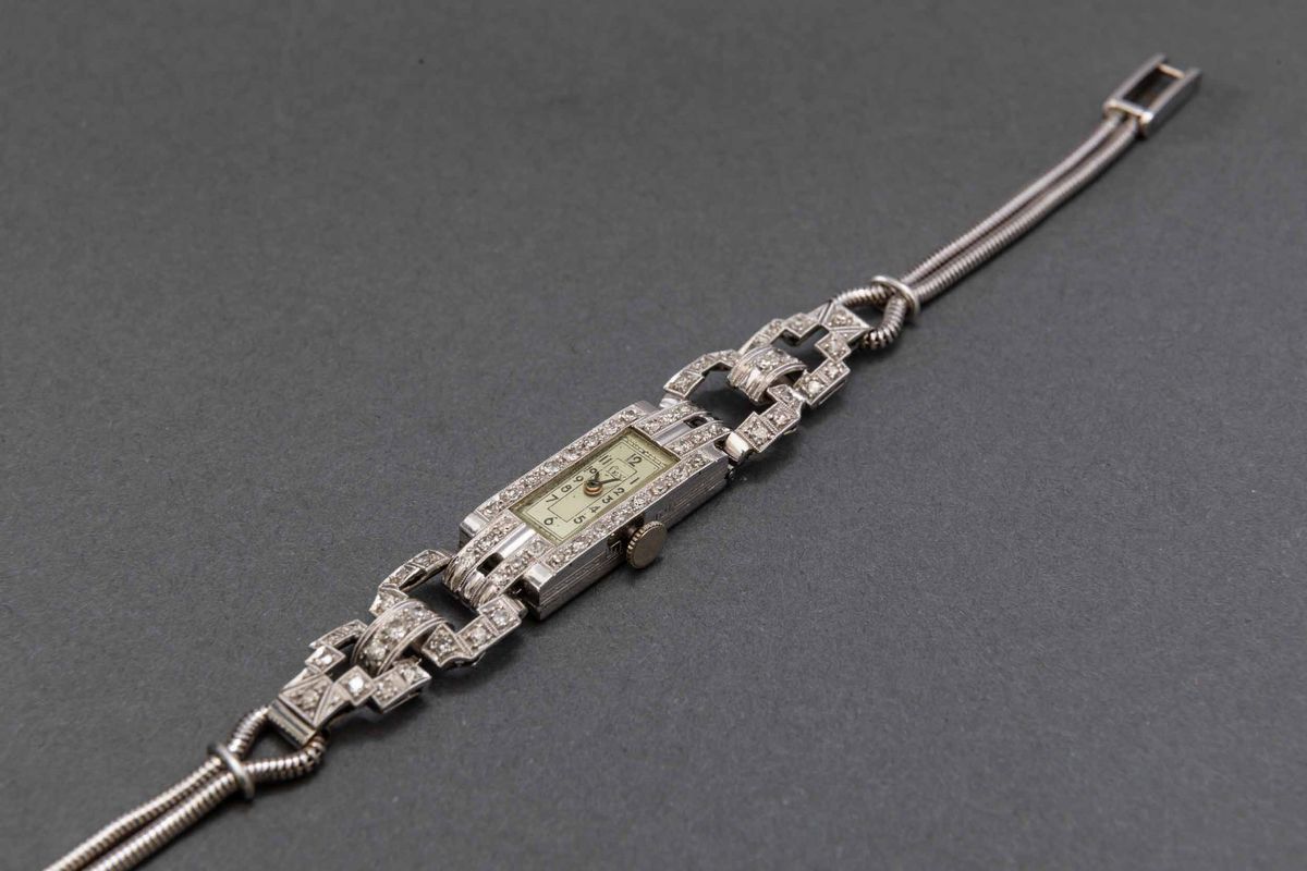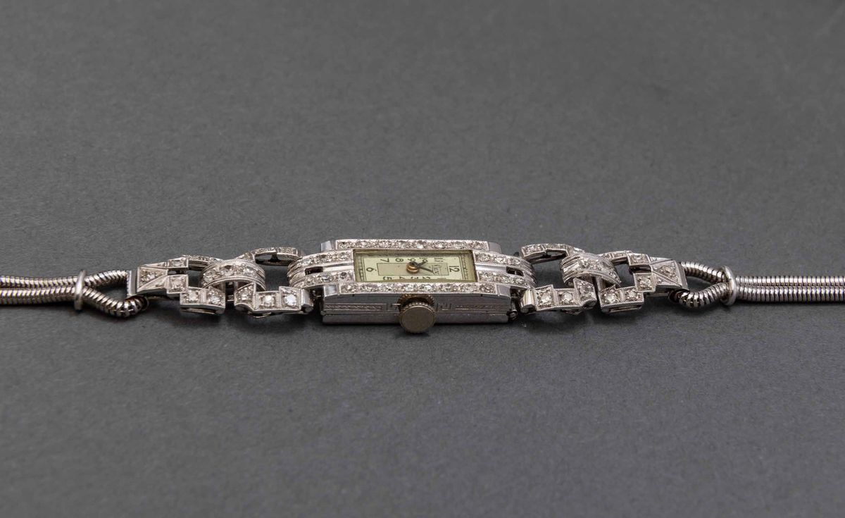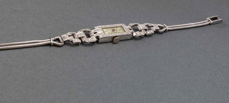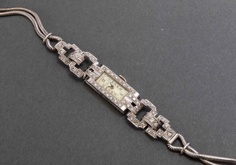 Orologio da sera in platino e diamanti taglio huit-huit, anse snodabili e quadrante color avorio