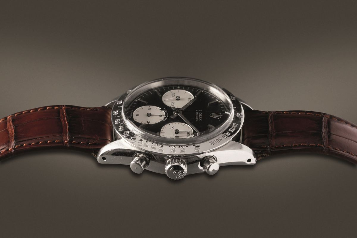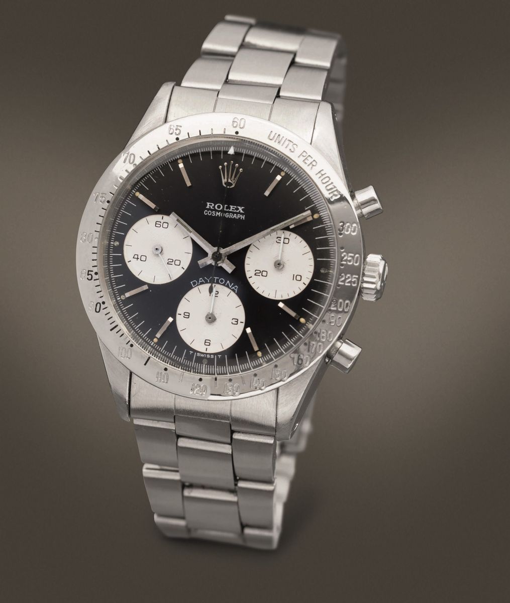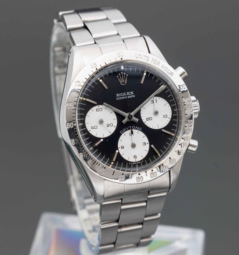 ROLEX - Cosmograph Daytona ref 6239 in acciaio con lunetta tachimetrica, quadrante nero tre contatori con scritta Daytona [..]