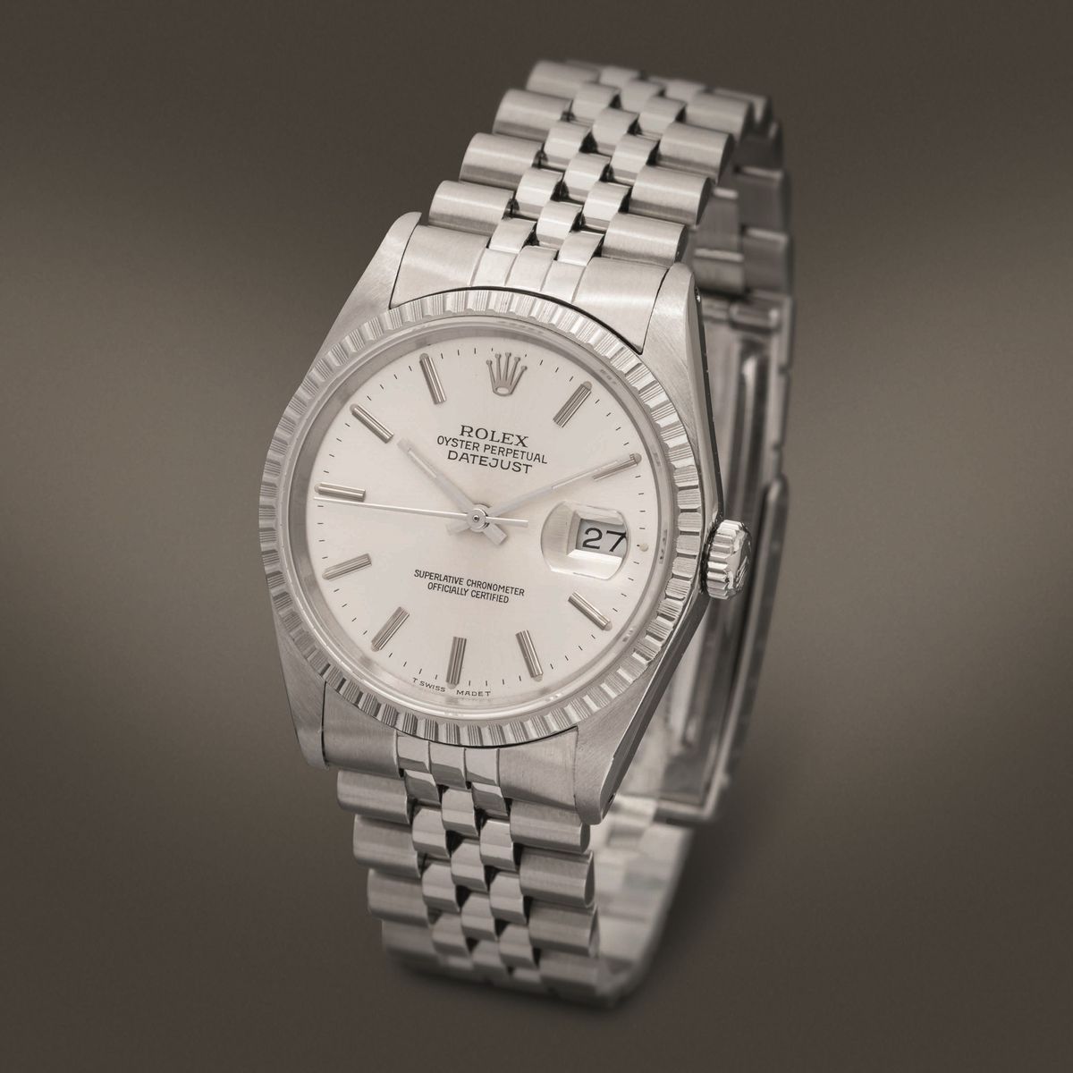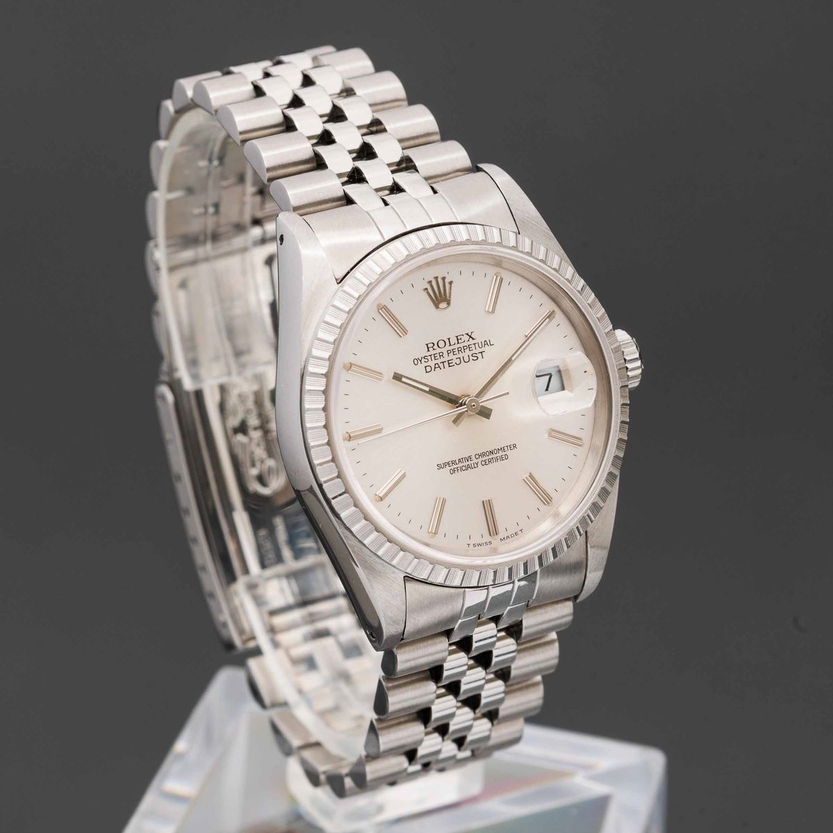 ROLEX - Datejust ref 16220 in acciaio automatico con datario, ghiera godronata quadrante Argentè con indici a bastone e [..]