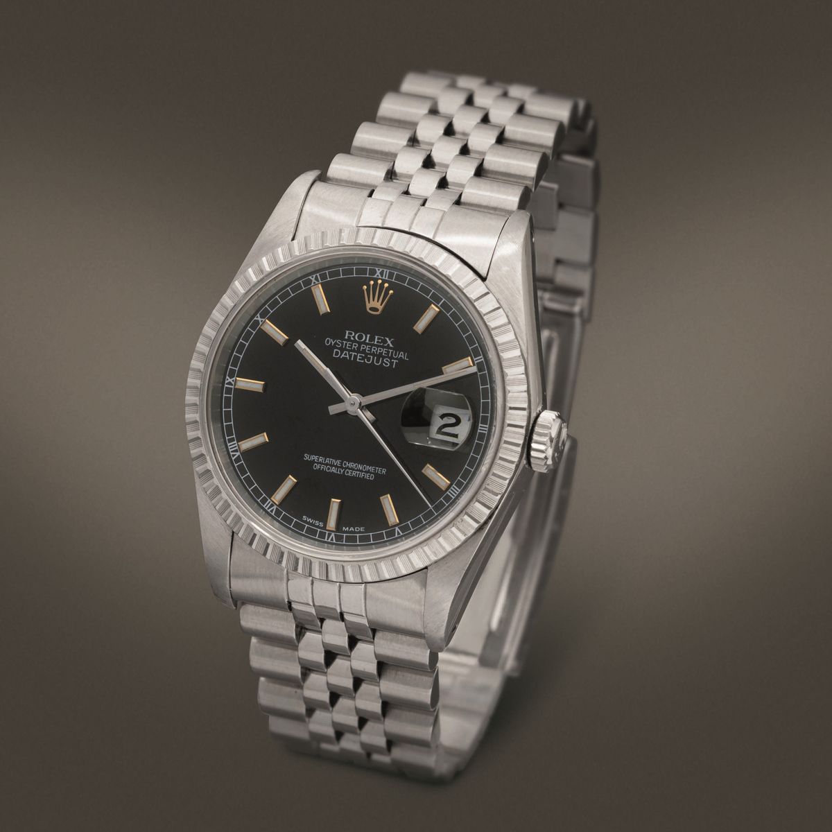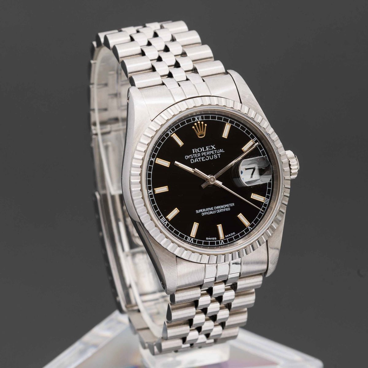 ROLEX - Datejust ref 16220 in acciaio automatico con datario, ghiera godronata quadrante Nero con indici a bastone in oro [..]