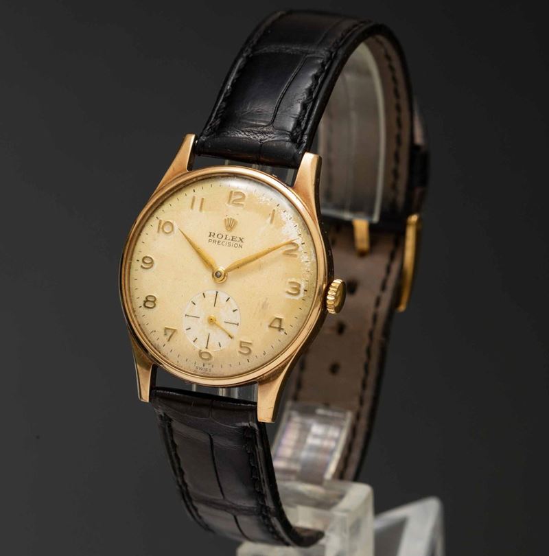 ROLEX - Precision in oro giallo 18k, carica manuale con piccoli secondi, quadrante Argentè patinato con numeri Arabi applicati. [..]