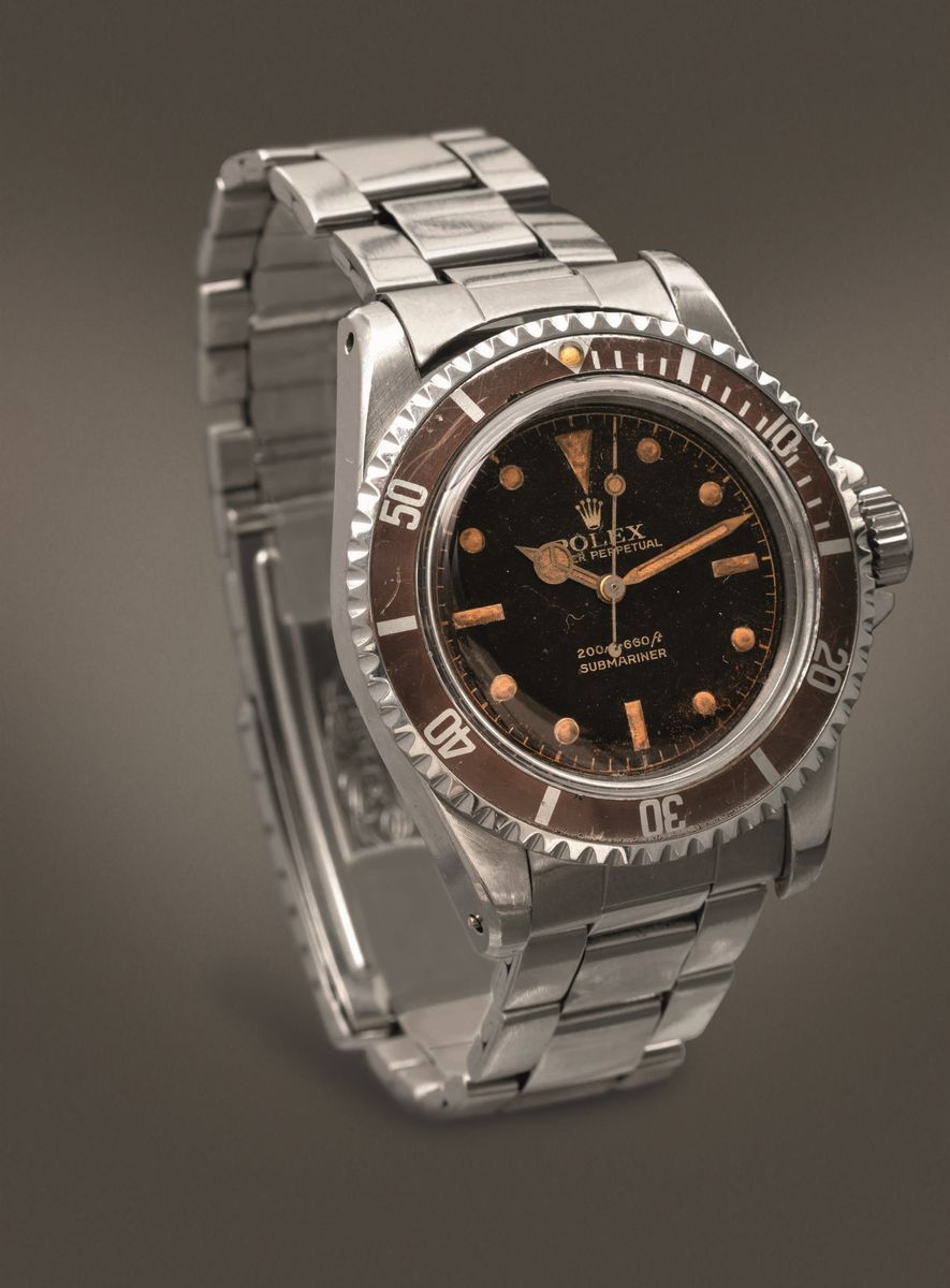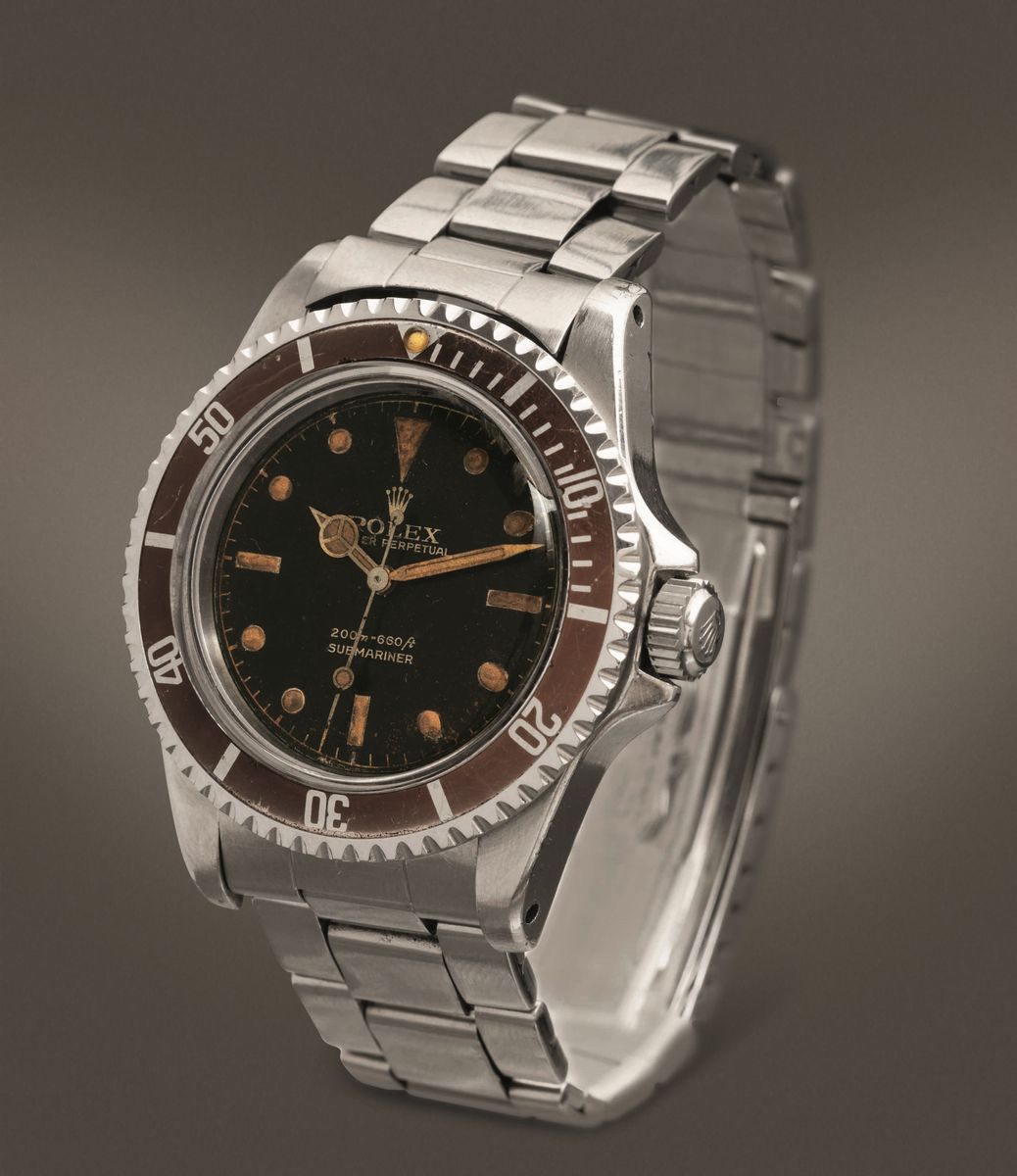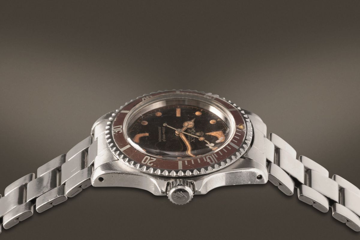 ROLEX - Raro Submariner ref 5512 "Cornino" in acciaio con ghiera e quadrante gilt virati al marrone.