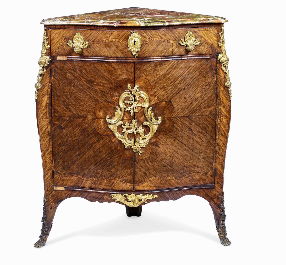 Fronte mosso a due ante e un cassetto, lastronatura in palissandro con il motivo del quadrifoglio, piano in marmo,