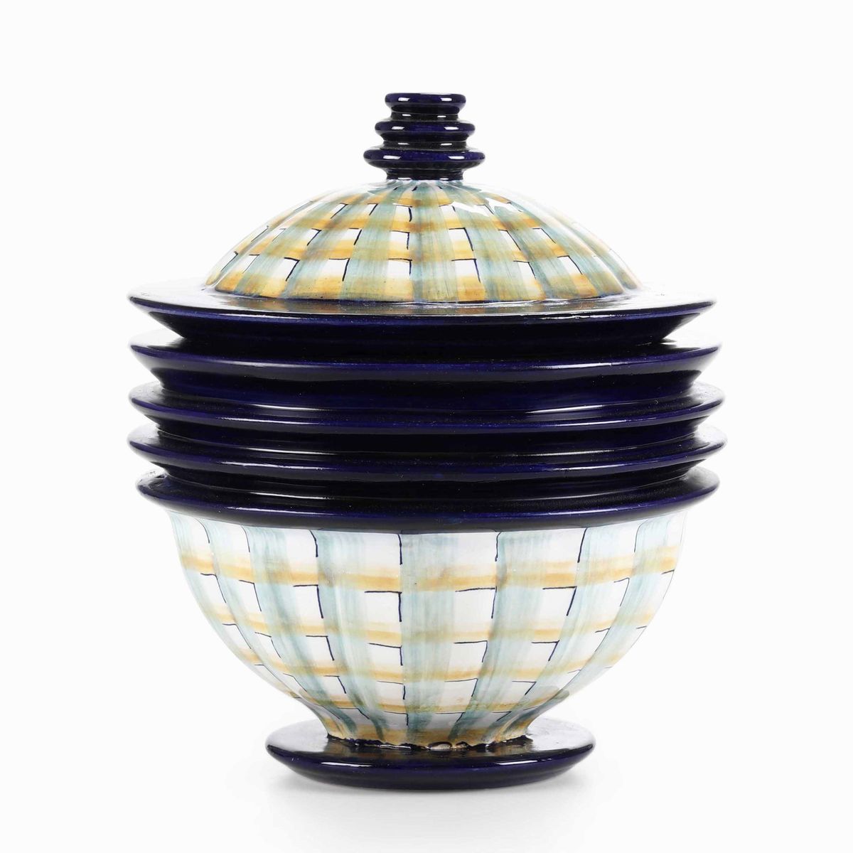 Scatola in terracotta maiolicata con decoro a smalti policromi futurista