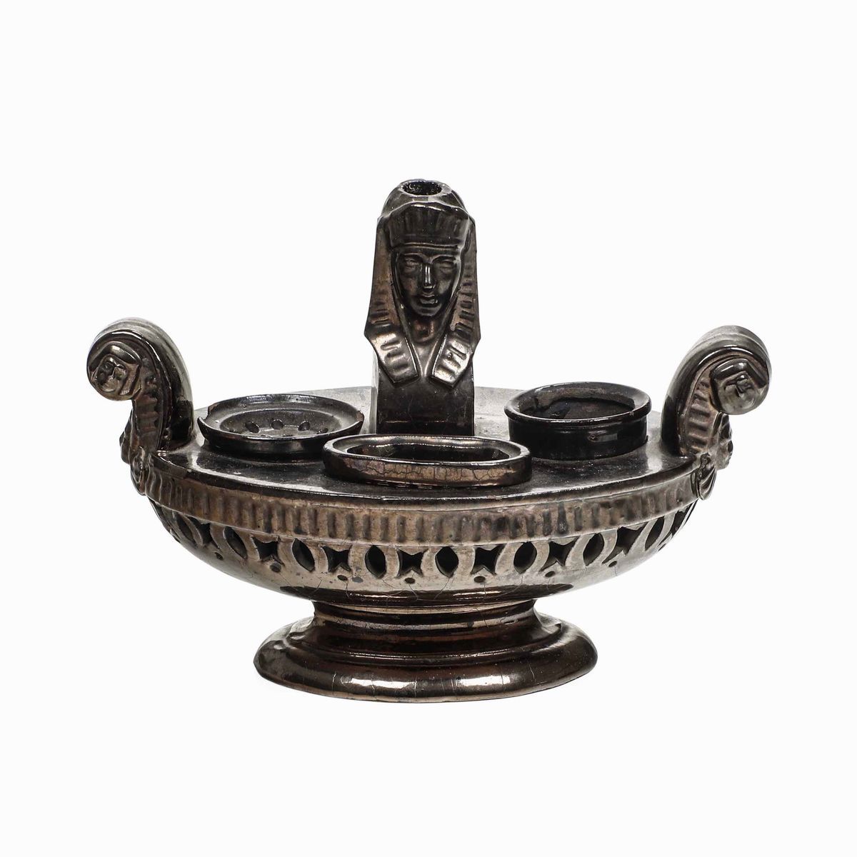 Il calamaio ha la presa, che funge da portapenne, modellata a bustino egizio. E' completo delle tre vaschette asportabili: una ovale, una rotonda per l'inchiostro e una spargi polverino