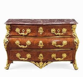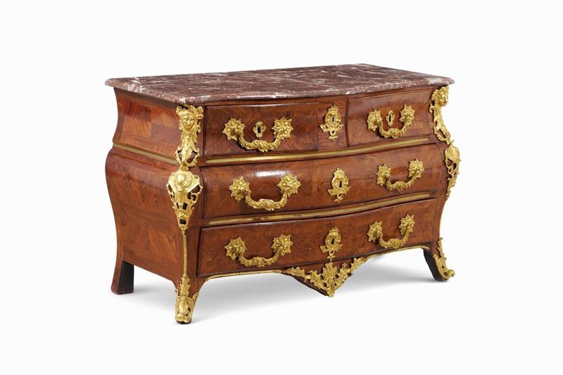 Forma bombata, lastronata in bois the rose con guarnizioni in bronzo riccamente cesellate e dorate a foggia di teste femminili e rocailles. Piano in marmo rosso