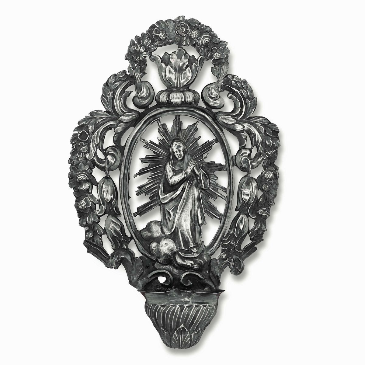 Acquasantiera con Vergine Immacolata. Argento sbalzato, traforato e cesellato. Genova XVIII-XIX secolo