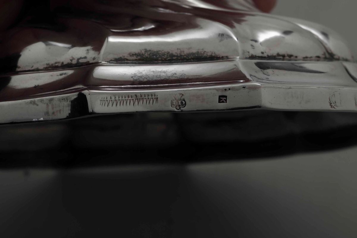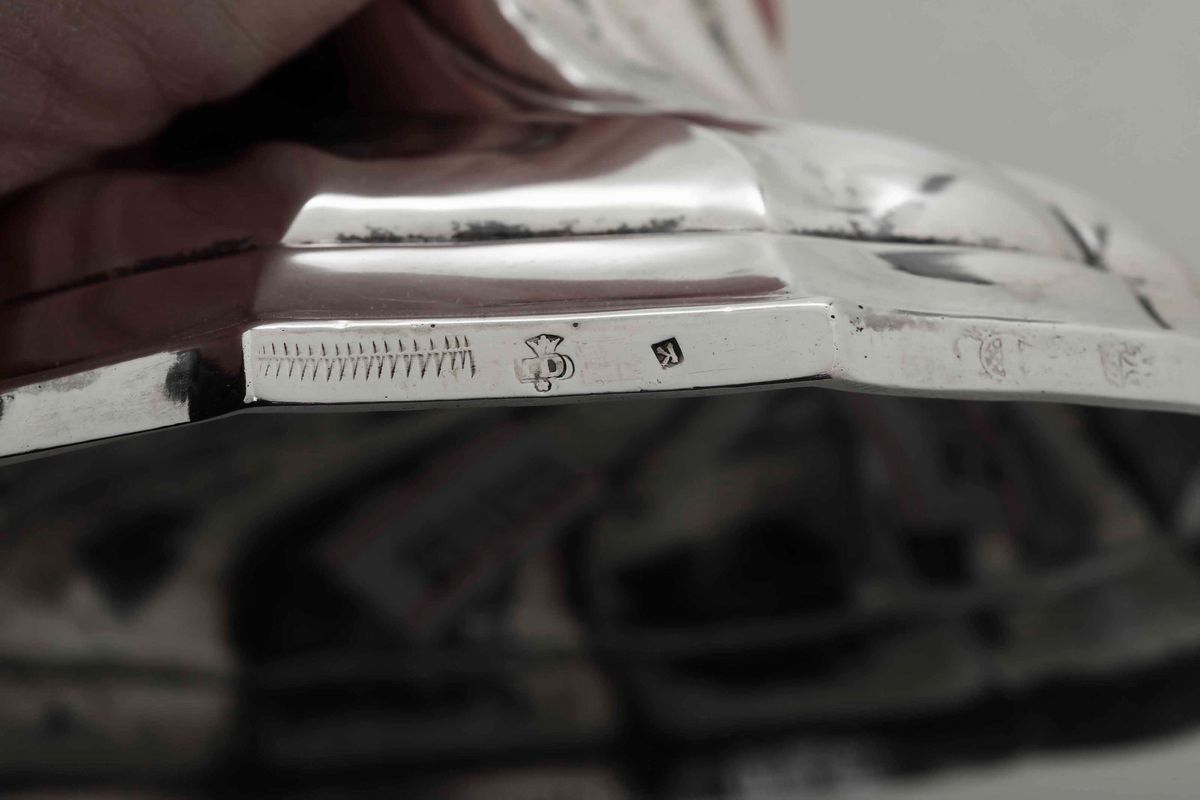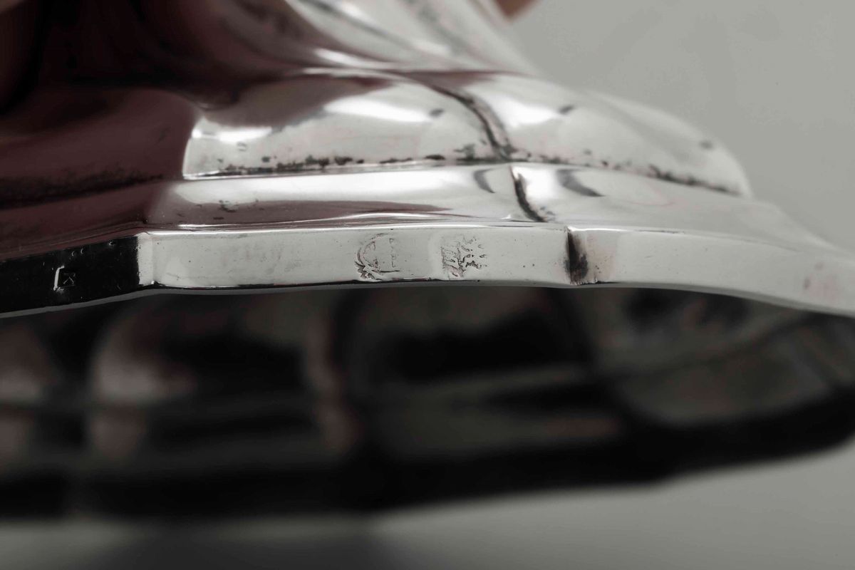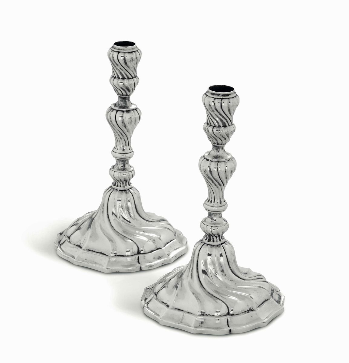 Coppia di candelieri in argento fuso, sbalzato e cesellato. Belgio, città di Liegi 1772