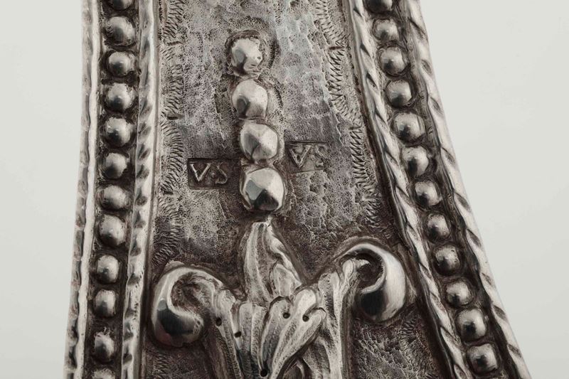 Marchio dell’argentiere V.S entro rettangolo (non identificato) e monogramma inciso F.E.R