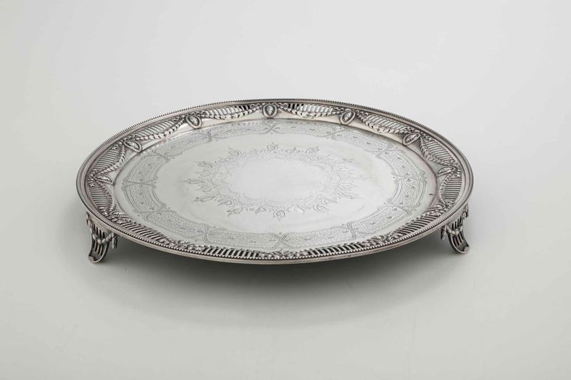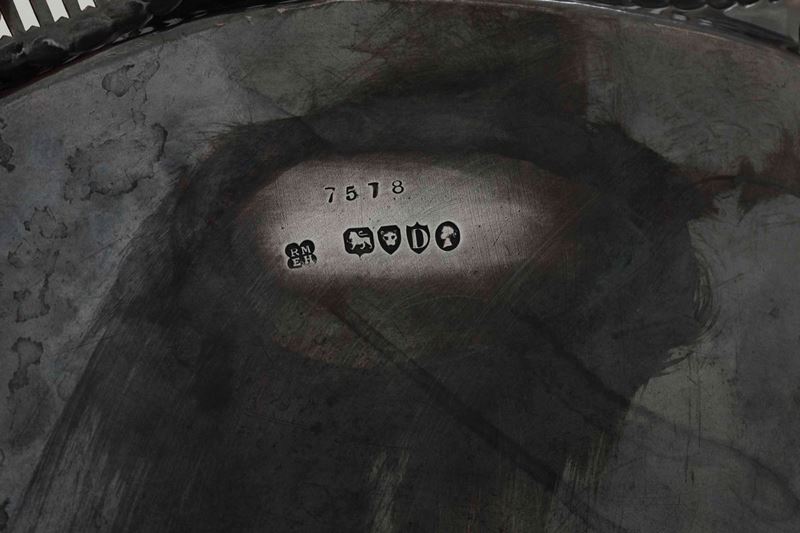 Salver. Argento fuso, sbalzato, traforato e cesellato. MArchi della città di Londra per il 1879 e dell'argentiere RMEH (non [..]