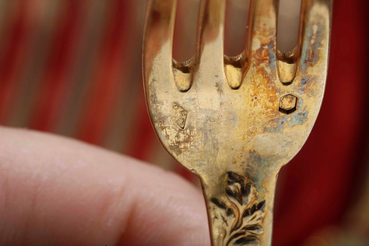 Servizio do posate da dessert per 18 persone. Argento primo titolo vermeille. Francia XIX secolo (Parigi?). Argentiere SH con sole e stella