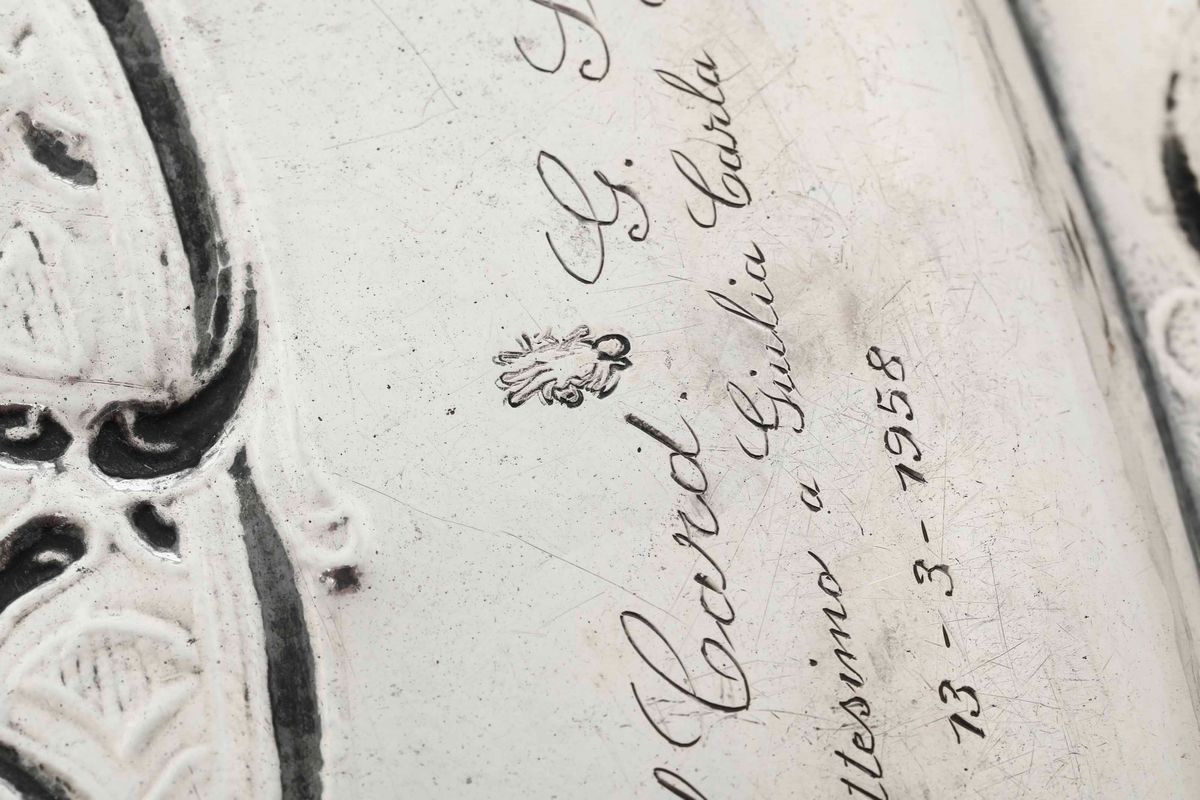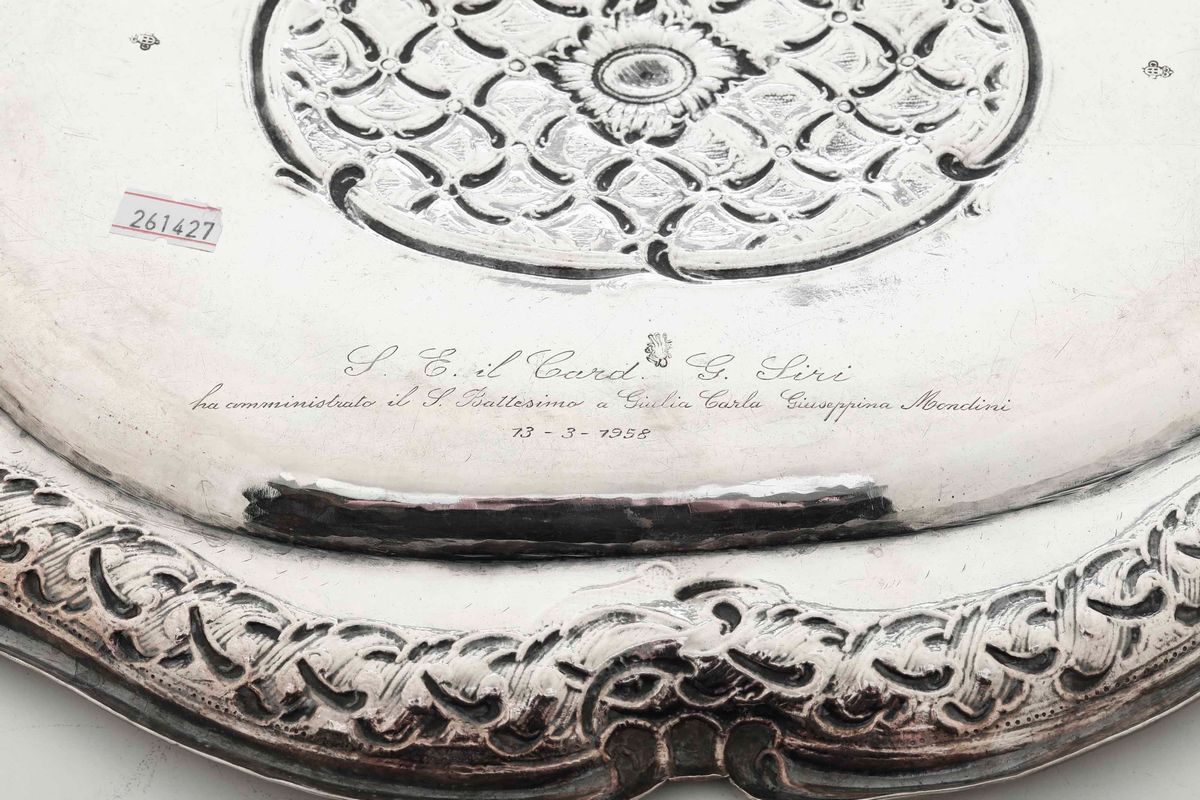 Vassoio. Argento fuso, sbalzato e cesellato. Marchi della città di Torino. Assaggiatore Giovanni Damonde (?) e dell’argentiere [..]