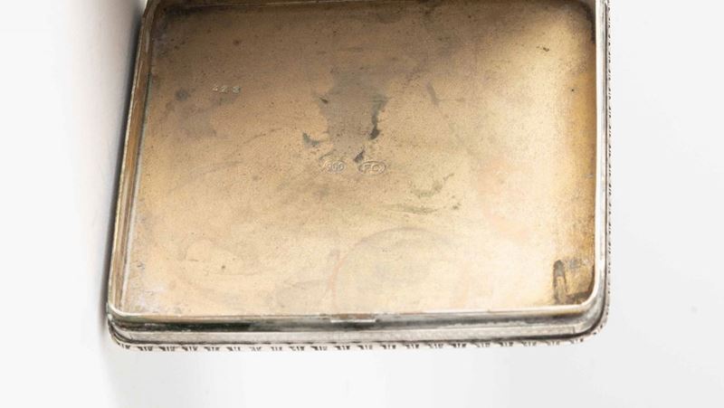 Due portasigarette. Argento fuso, cesellato e smalti colorati. Argenteria artistica del XX secolo