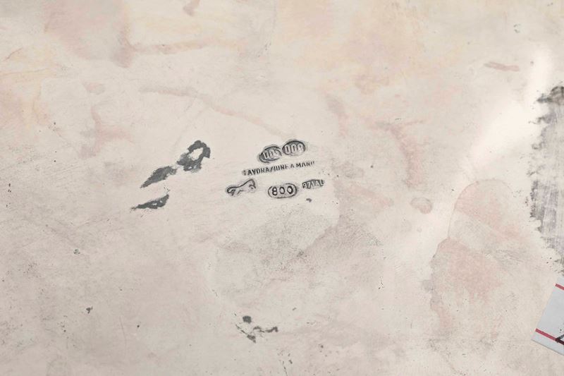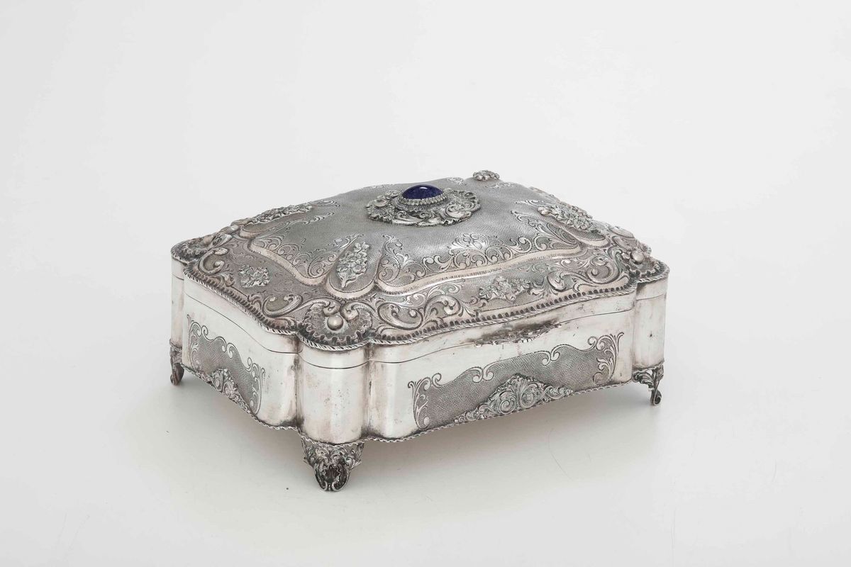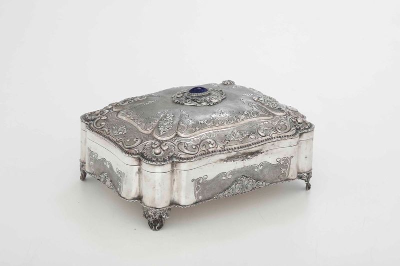 Portagioie. Argento fuso, sagomato e cesellato, castone con pietra blu cabochon. Argenteria artistica italiana del XX secolo. [..]