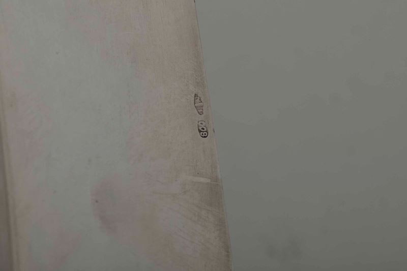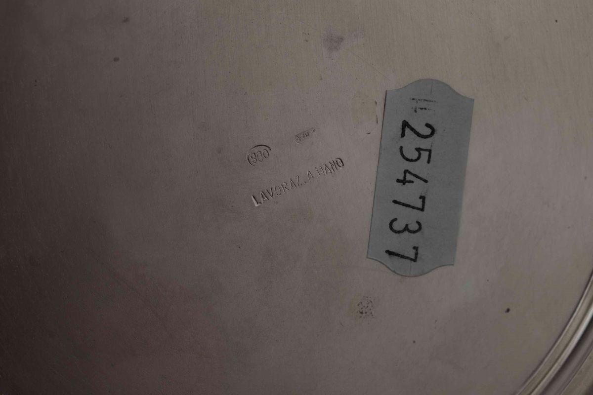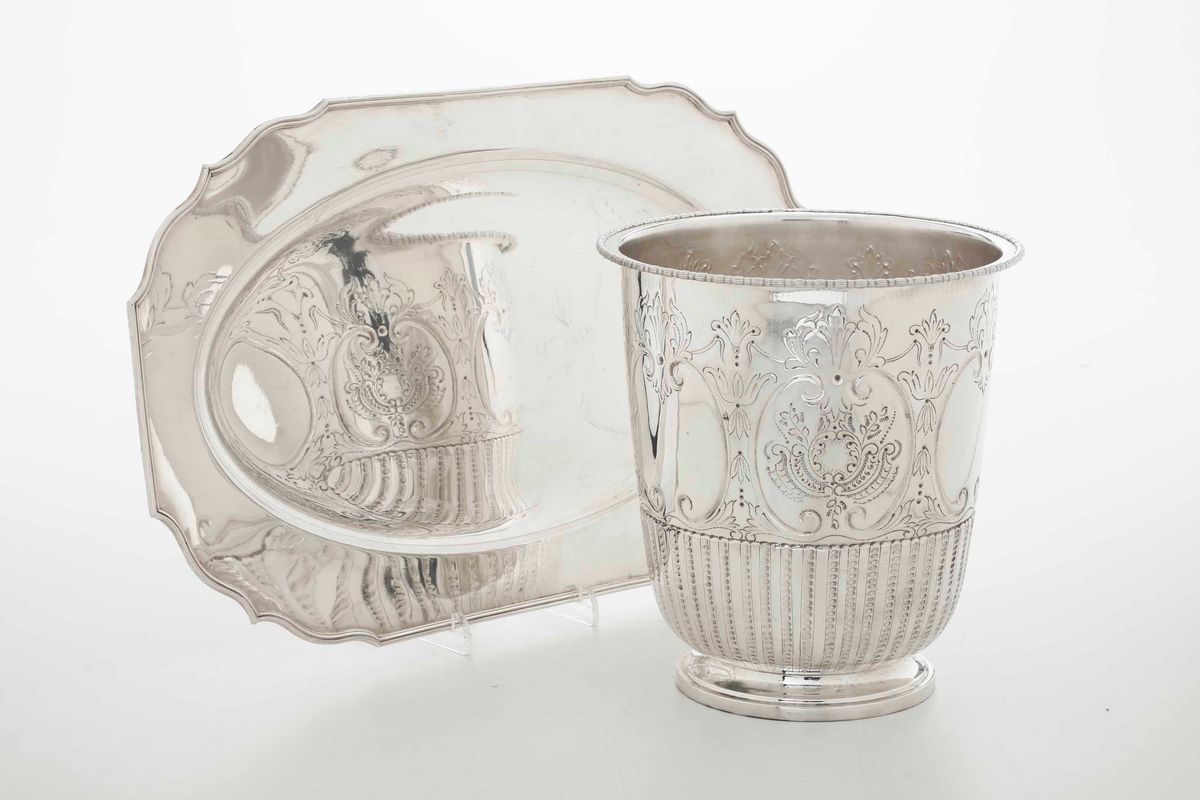 Secchiello e vassoio. Argento fuso e sagomato. Argenteria italiana del XX secolo. Marchio con fascio littorio in uso da l 1935 al 1945. Argentiere Cesa, Alessandria