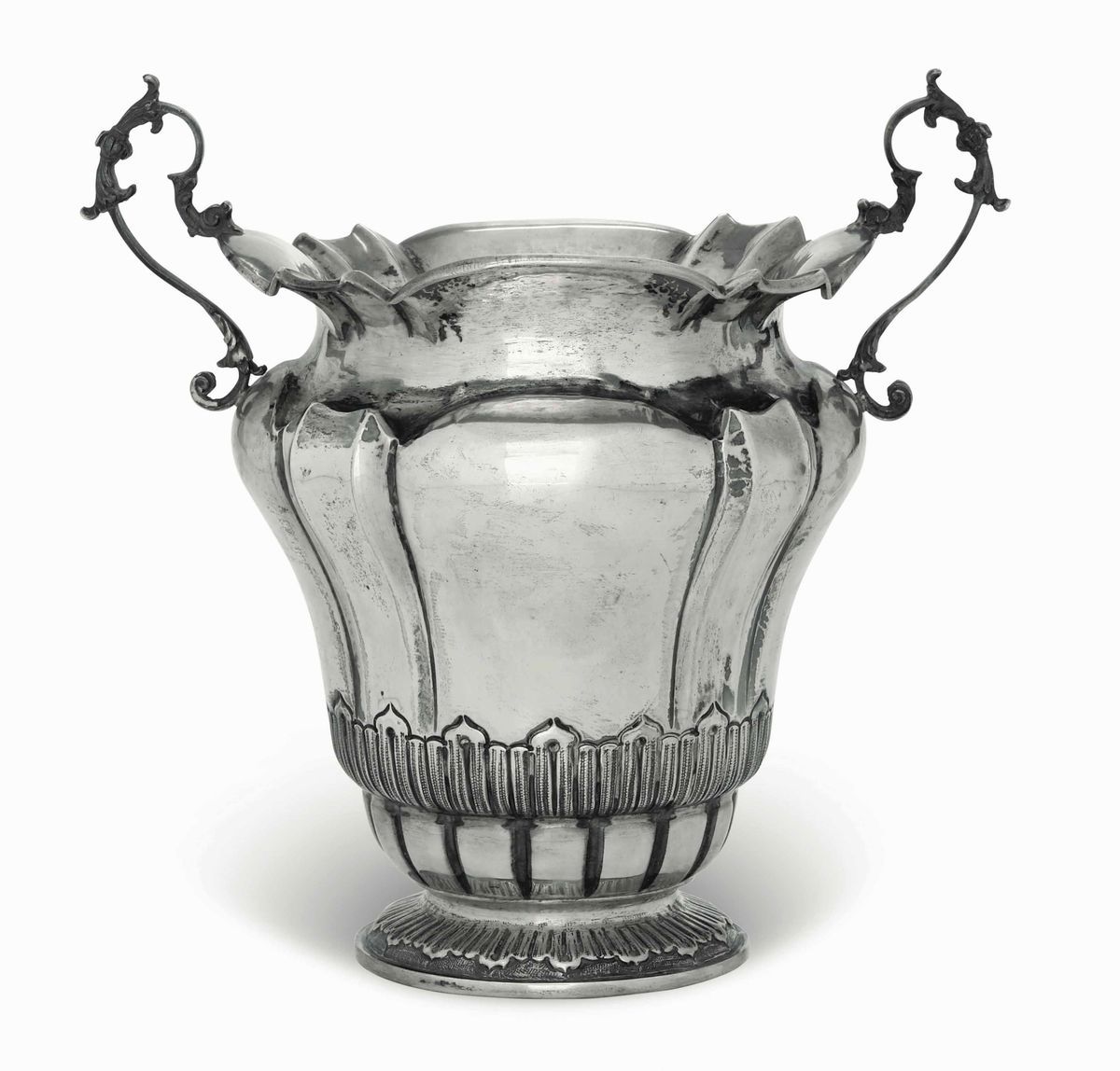 Corpo a larghe costolature e anse a volute. Decori di gusto neo rococò