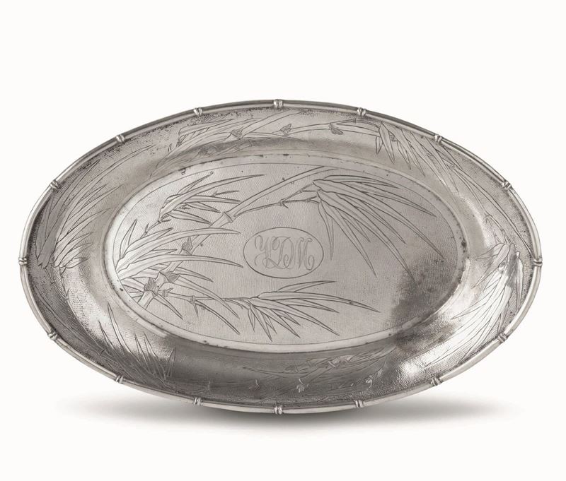 Vassoio ovale. Argento fuso, sagomato e cesellato. Cina XX secolo