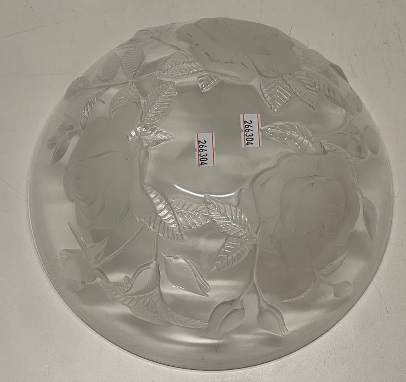 Ciotola in vetro incolore decorata con rose in rilievo.