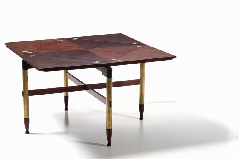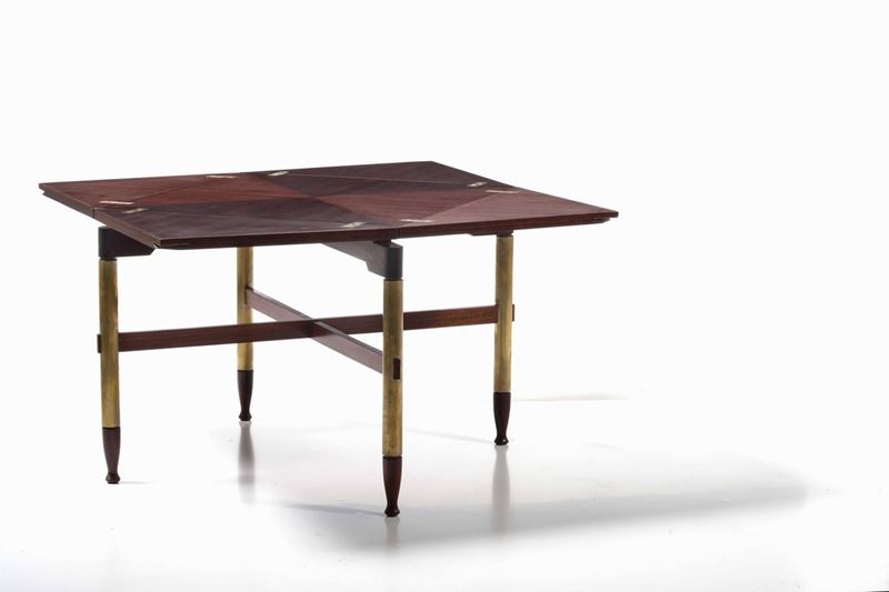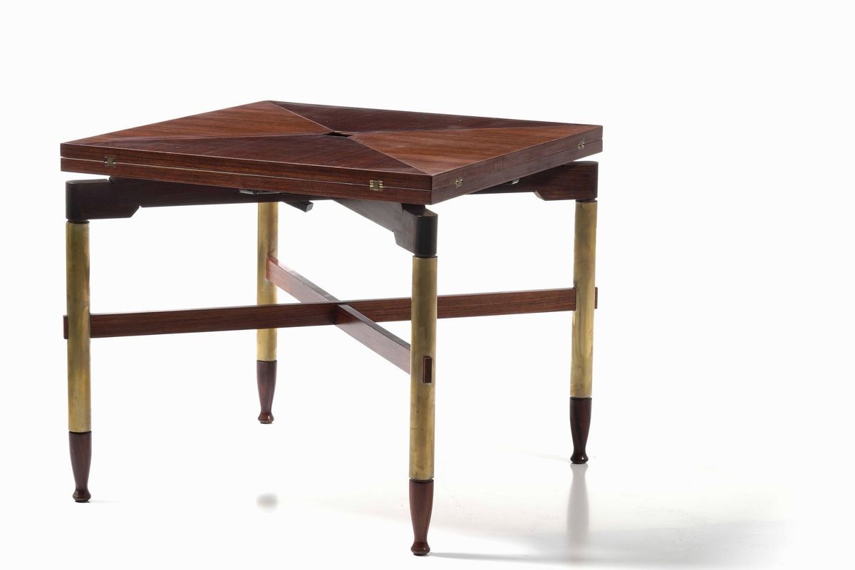 Struttura in ottone nichelato e legno con puntali in legno. Piano in legno con angoli allungabili a ribalta.