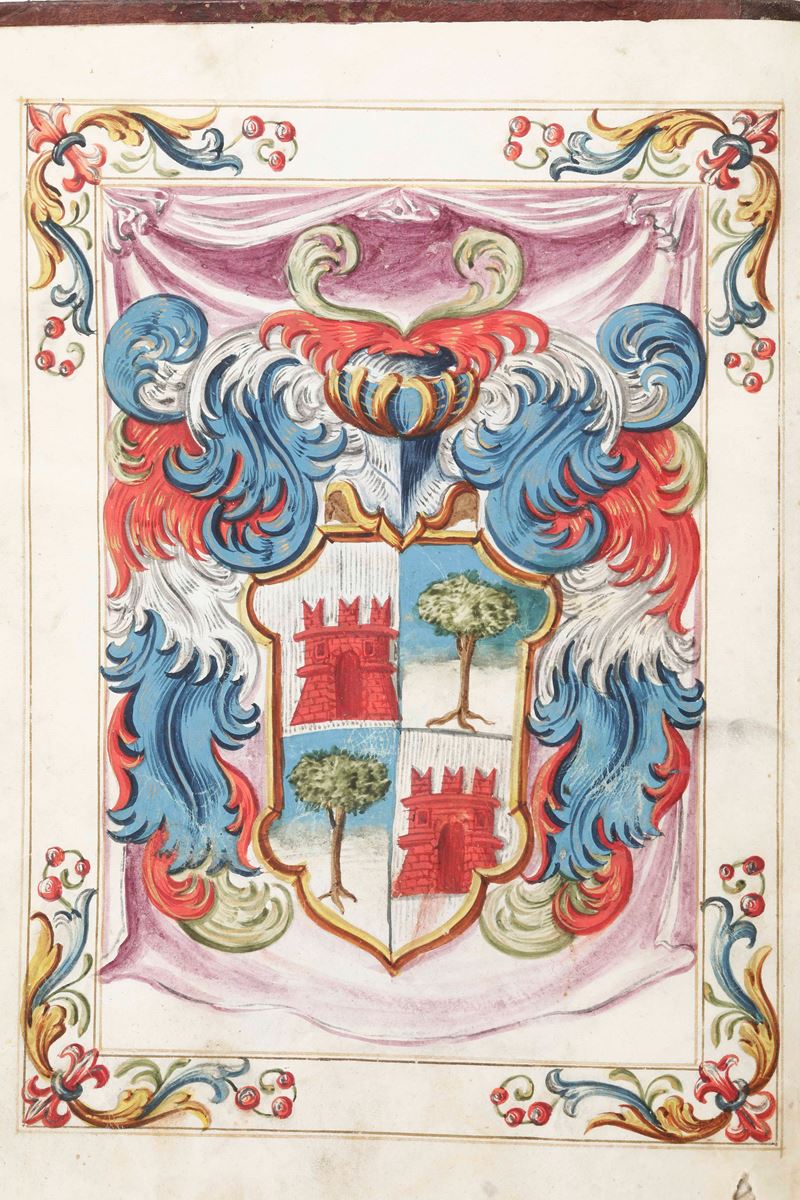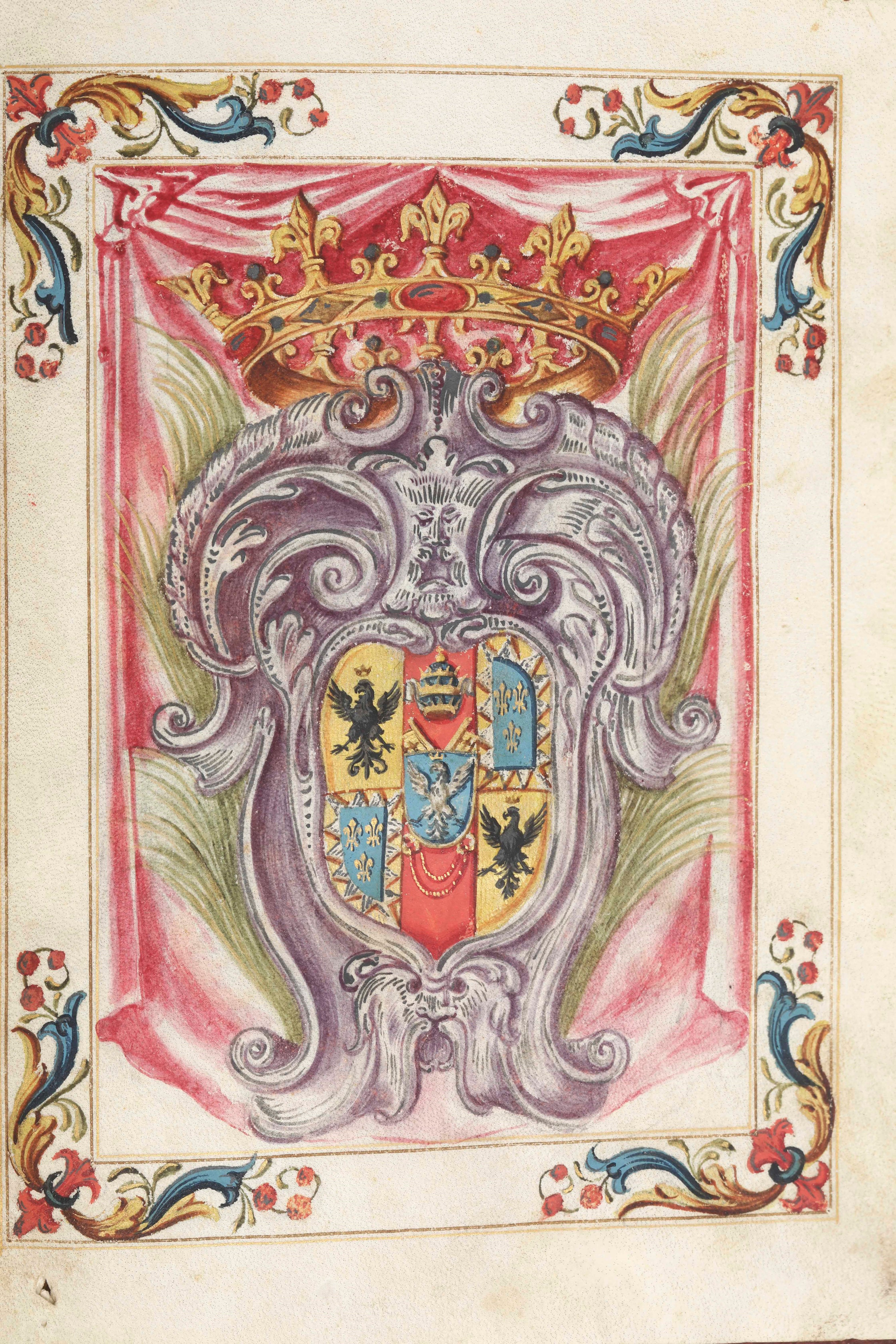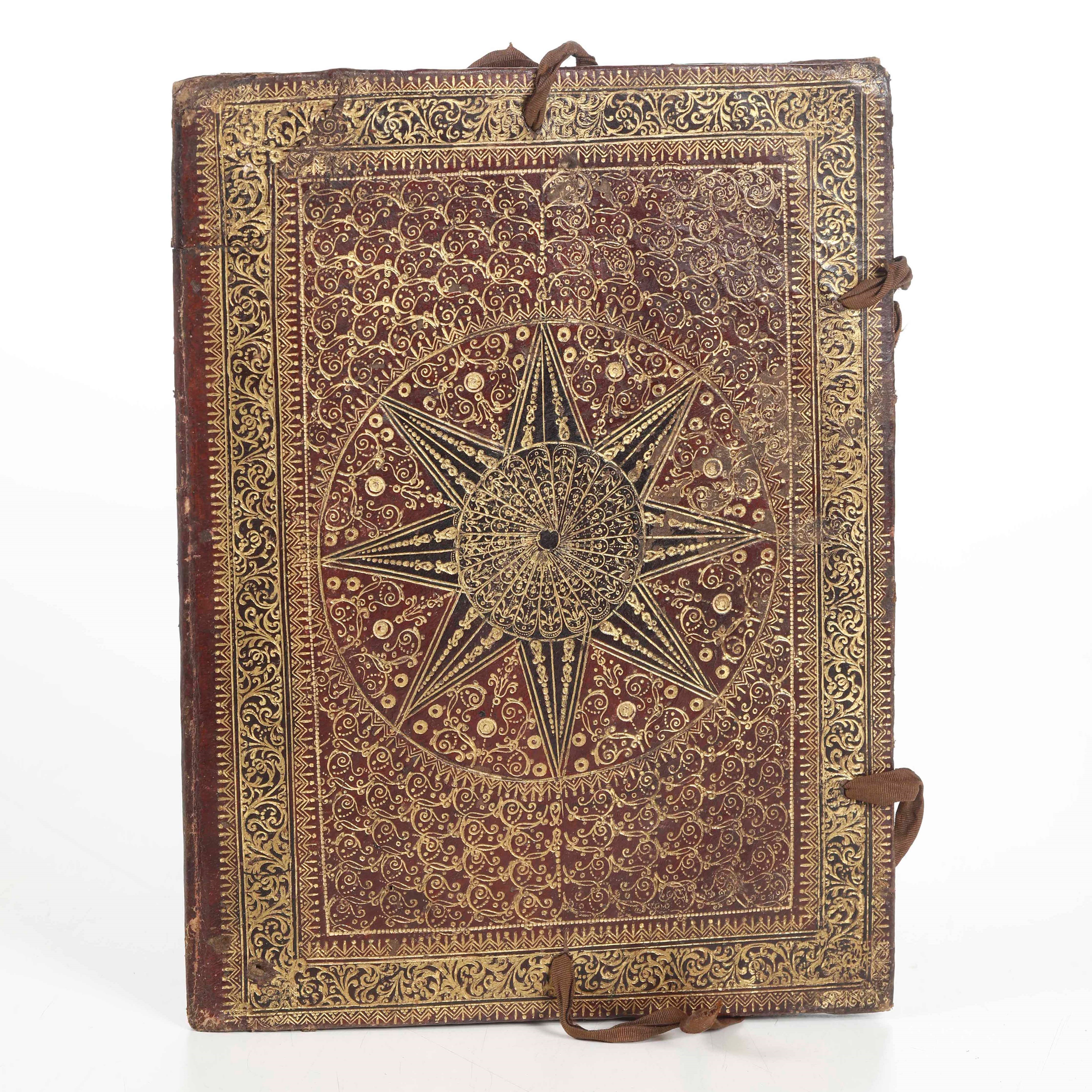 In-4°. Elegante rilegatura coeva lavorata ai piccoli ferri, riccamente incisa in oro. Legacci in seta. 8 carte pergamenacee. Antiporta e capilettera miniati. Scrittura in inchiostro bruno e oro.