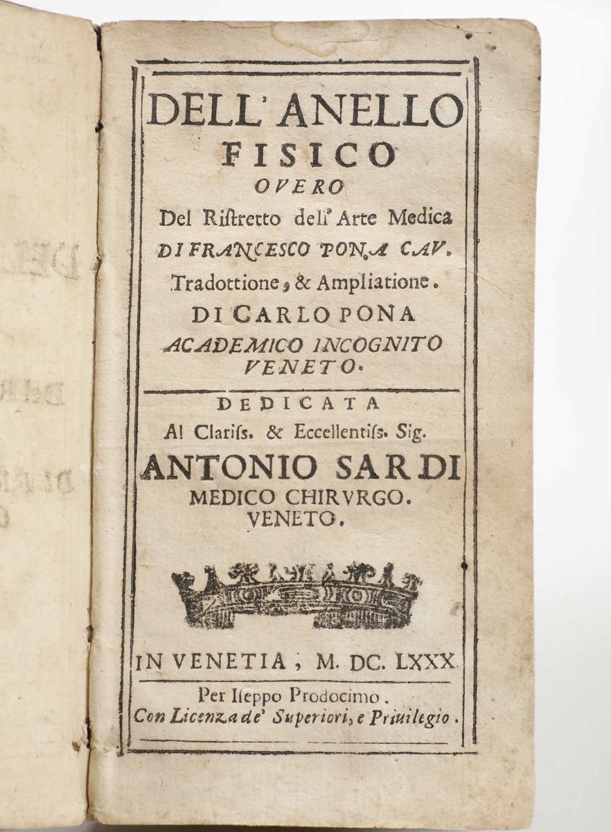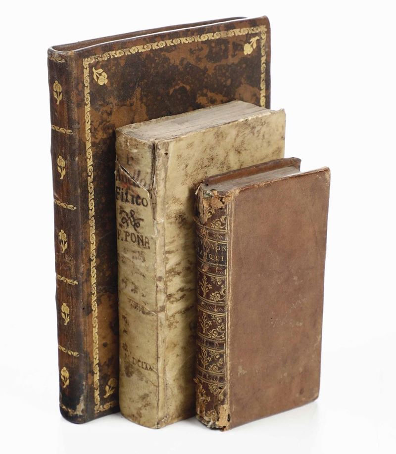 Al lotto si aggiungono: Gaio Svetonio Tranquillo - Caius Suetonius Tranquillus. Cum annotationibus diversorum, Amsterdami, Typis Ludovici Elzevirii, 1650. / Carlo Pona - Dell’anello fisico...in Venetia, 1680.