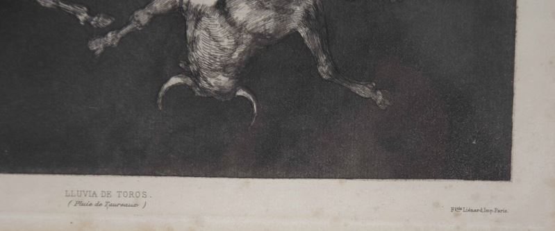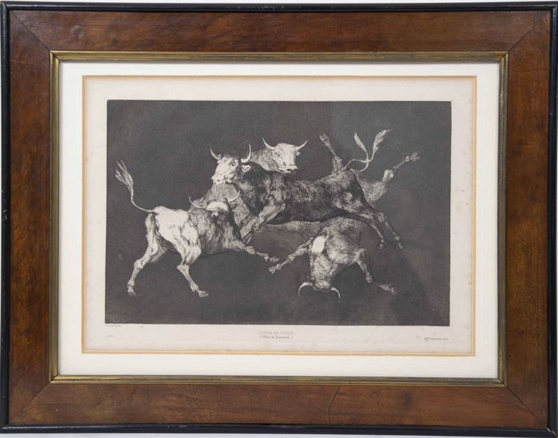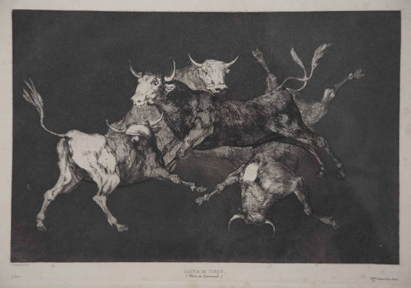 1)" Al toro y al aire darles calle". Pubblicata da "L'art" a Parigi con il titolo "Luvia de toros". Edizione del 1877. Acquaforte, acquatinta e puntasecca. Harris 269 III.