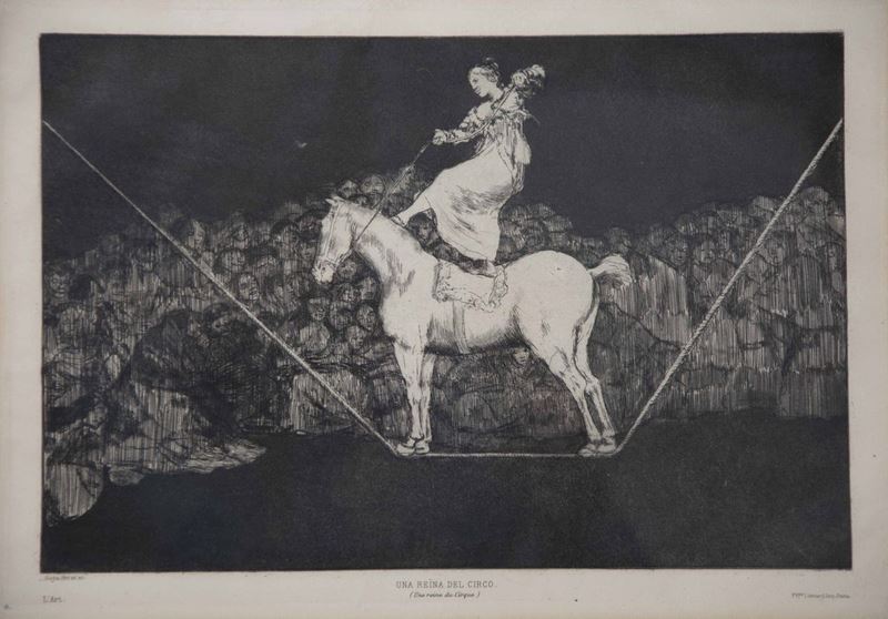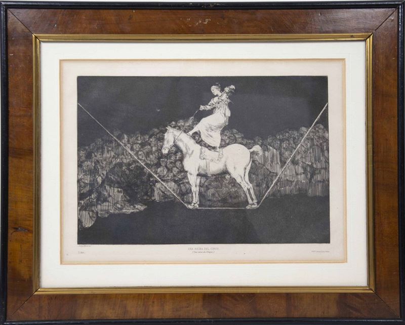 4)"Bailando en una cuerda floja". Pubblicata da "L'art" a Parigi con il titolo "Una reina del Circo". Edizione del 1877. Acquaforte, acquatinta e puntasecca. Harris 267 III.