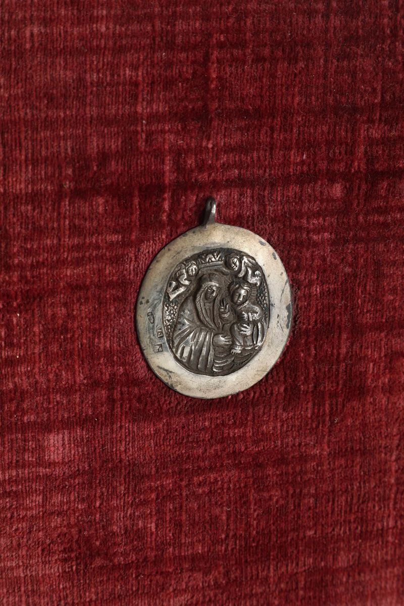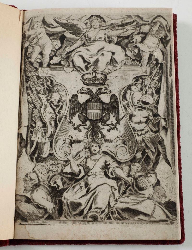 In-4°. Antiporta calcografica e 32 pp. numerate. Rilegatura in velluto della prima metà del secolo XX, con applicata al piatto anteriore, placchetta in argento, raffigurante la Beata Vergine con Gesù bambino, incoronata da due angeli.