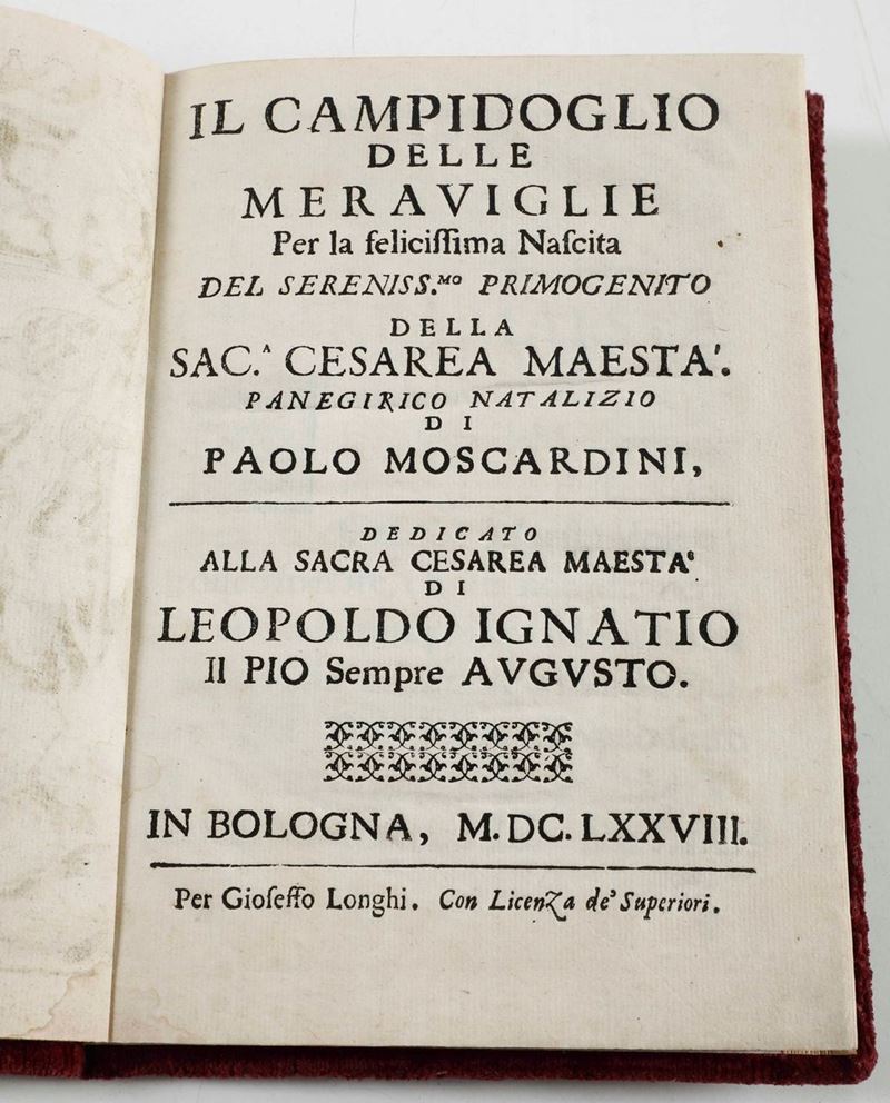 Moscardini, Paolo Il Campidoglio delle meraviglie per la felicissima Nascita del Sereniss.mo Primogenito della sac.a Cesarea Maestà...Bologna,Gioseffo Longhi, 1678