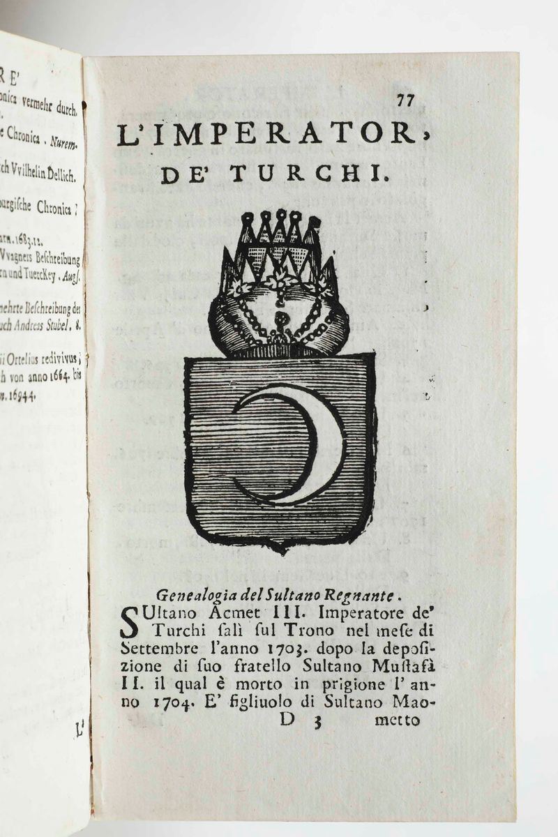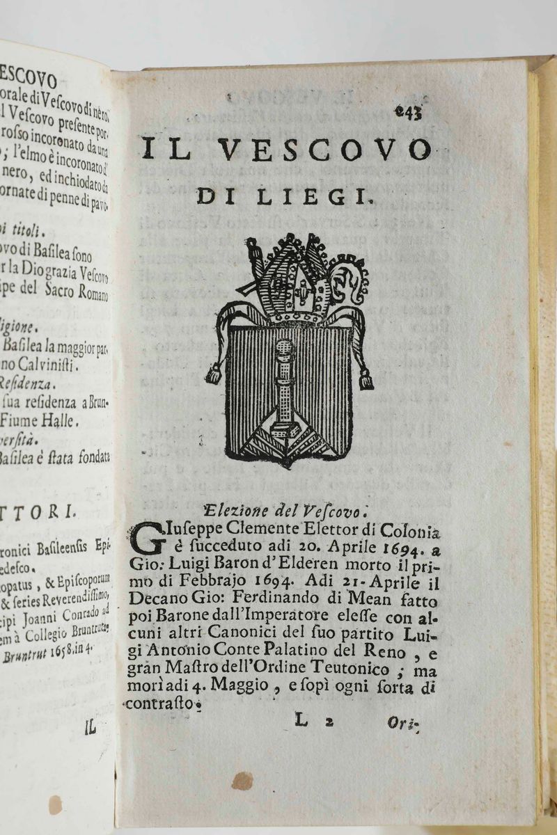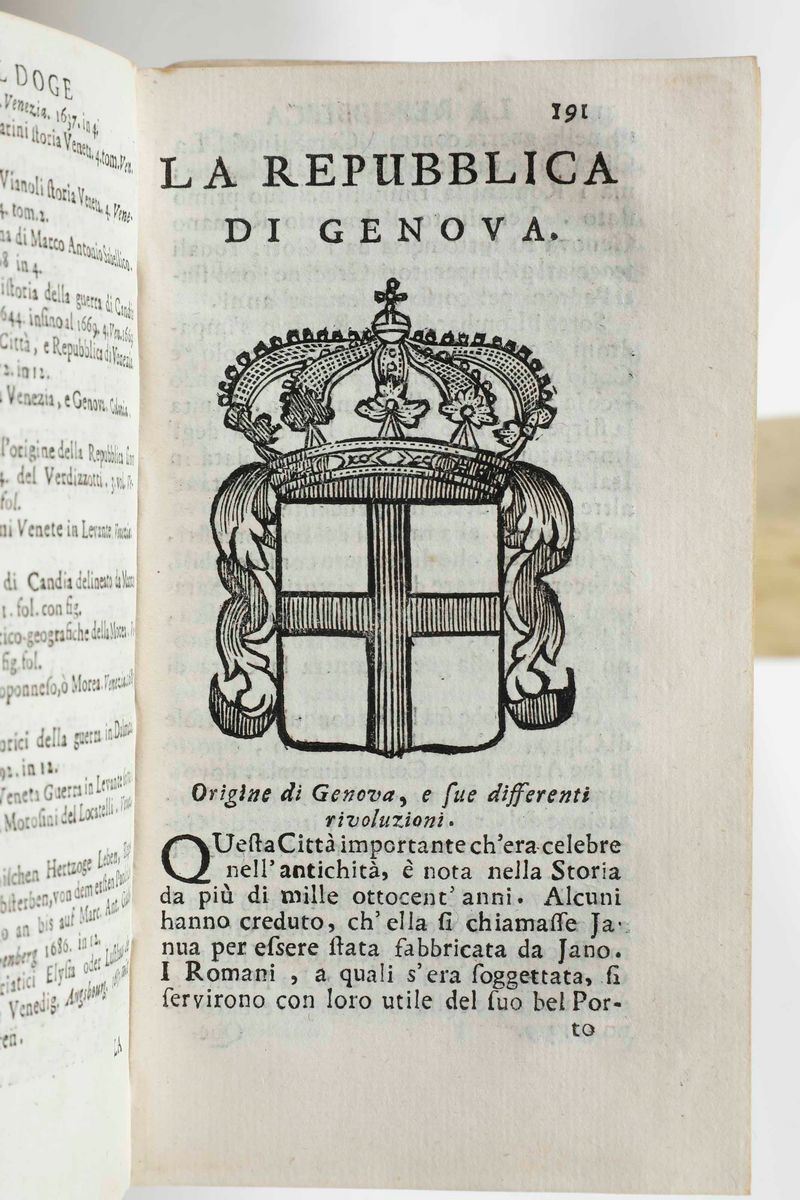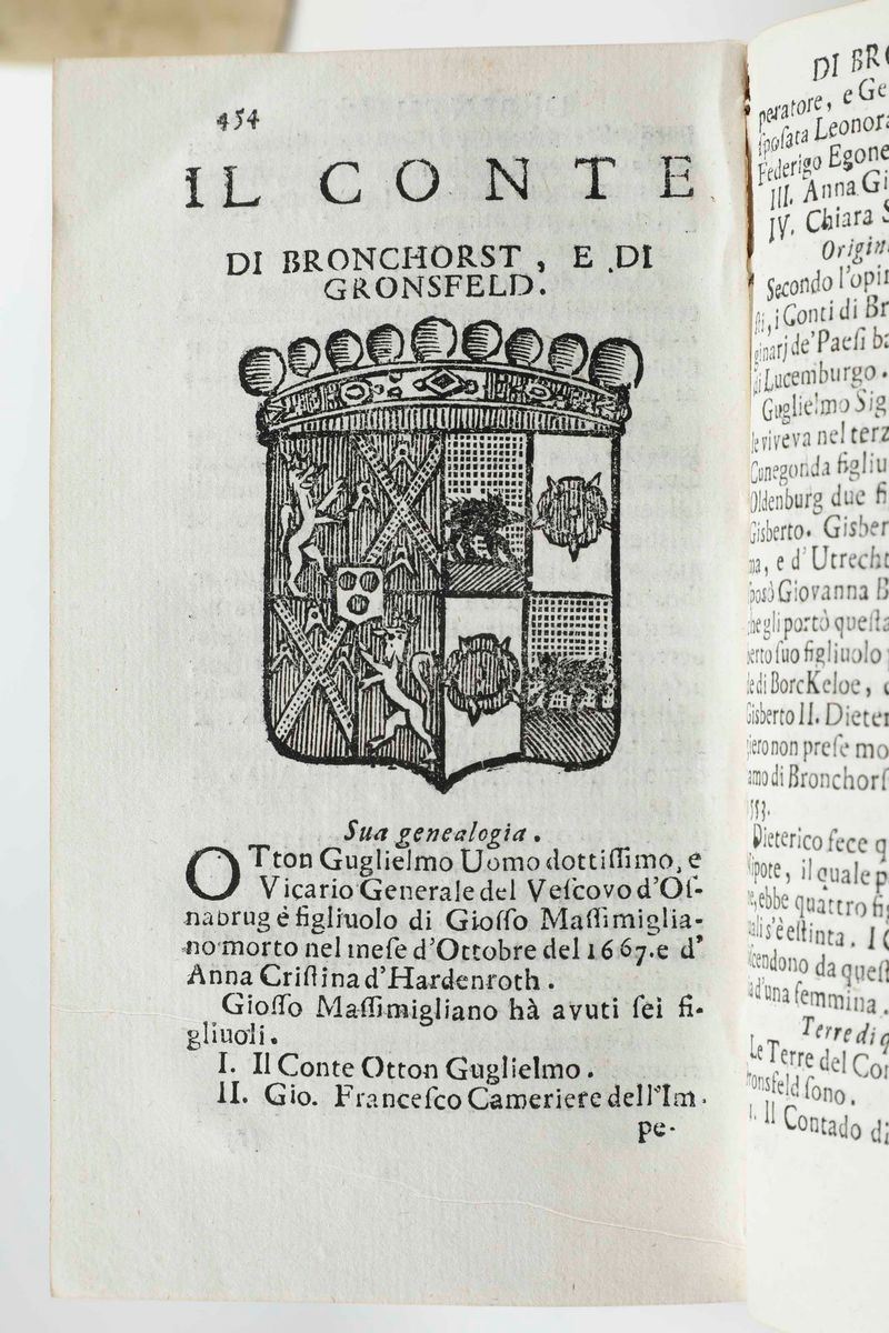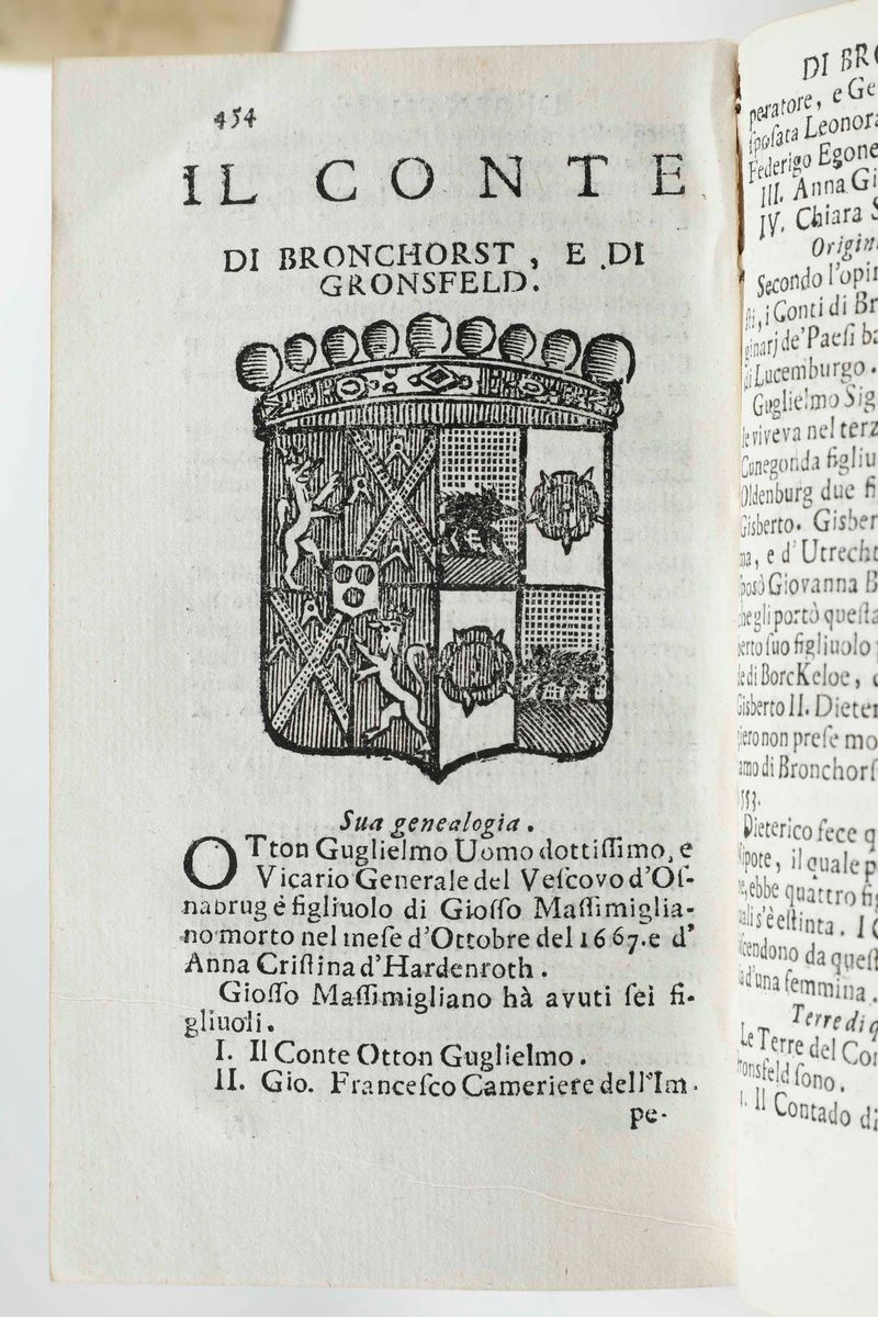 In-12°. Quattro volumetti rilegati in piena pergamena floscia. Tagli colorati in giallo. Opera illustrata da numerose armi nobiliari incise in xilografia