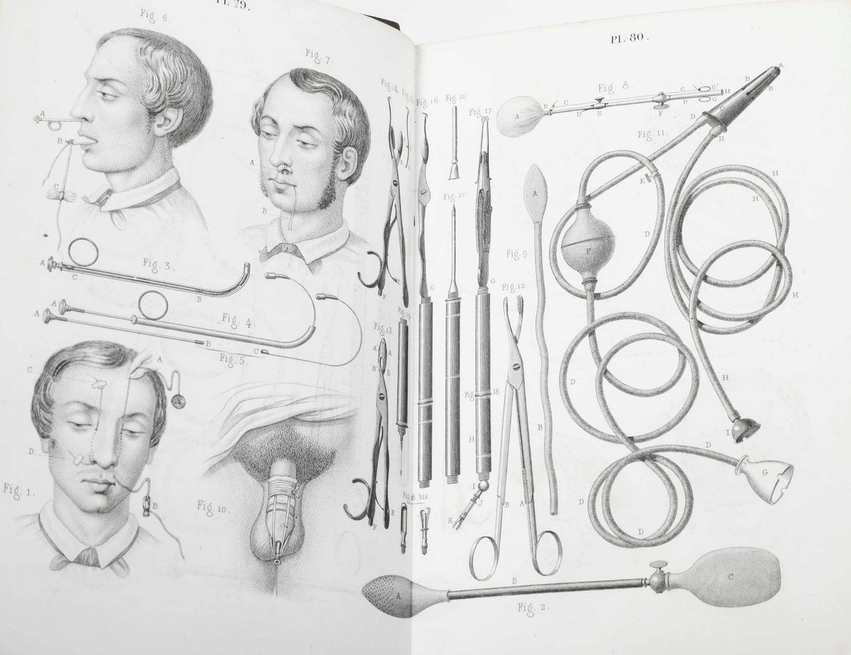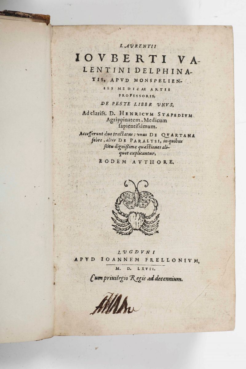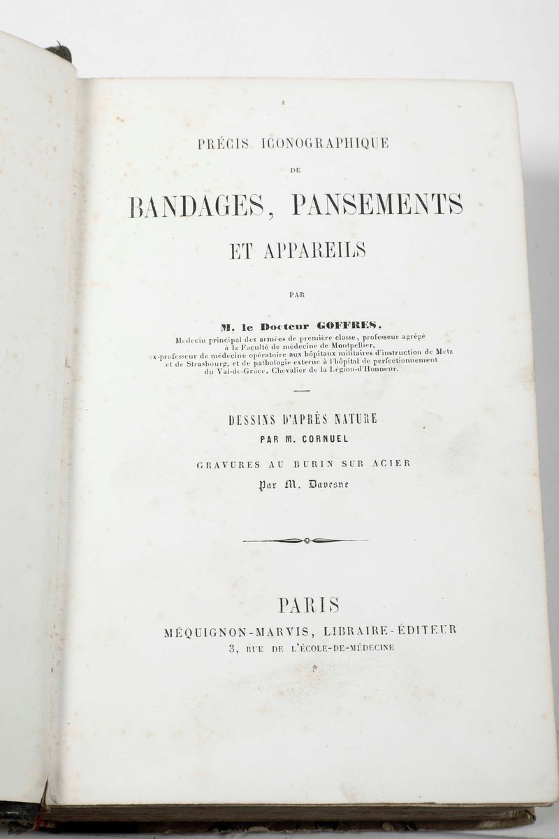 Al lotto si aggiungono: Joseph Marie Goffres - Précis iconographique de bendages, pansements et appareils, Mequignon-Marvis, Paris. / Laurentii Iouveri Valentini - De peste, apud Ioannem Frellonium, 1567