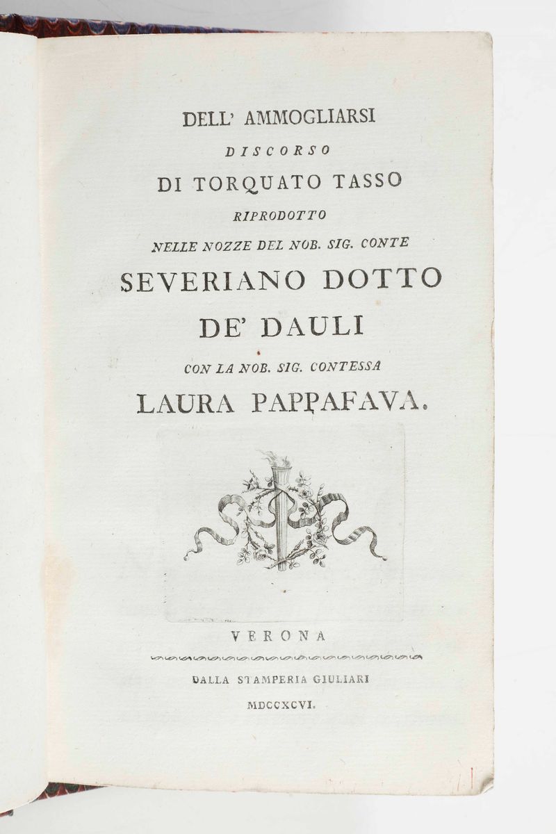 Dell'ammogliarsi discorso di... riprodotto nelle nozze del nob. sig. conte Severiano Dotto De'Dauli con la nob. sig. contessa Laura Pappafava...Verona, dalla Stamperia Giuliari, 1796