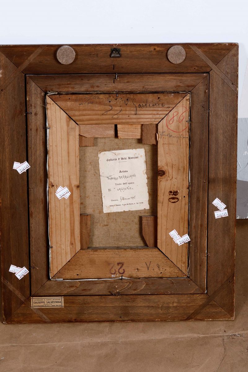 Al retro etichetta cartacea della Galleria Ranzini di Genova