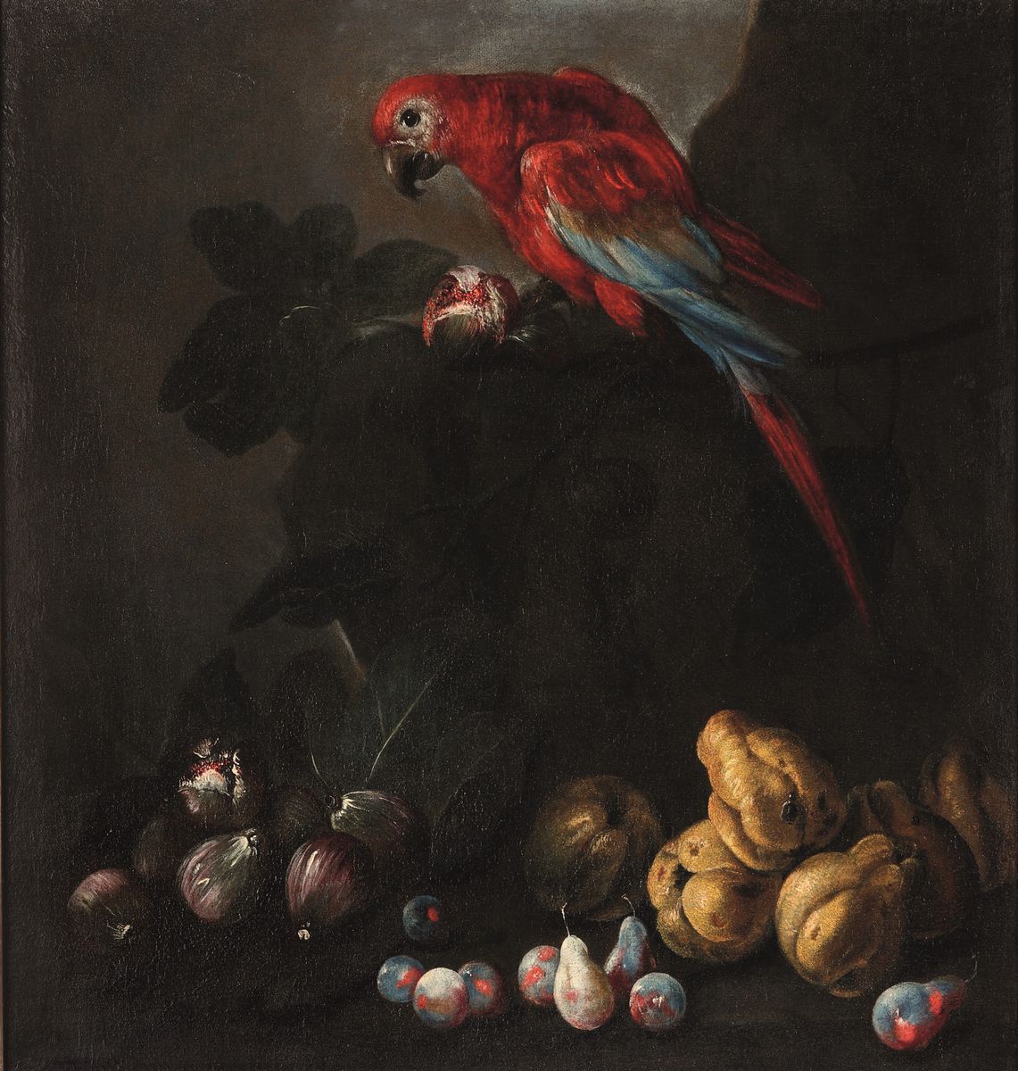 Scuola del XVII secolo Nature morte con pappagalli e frutta