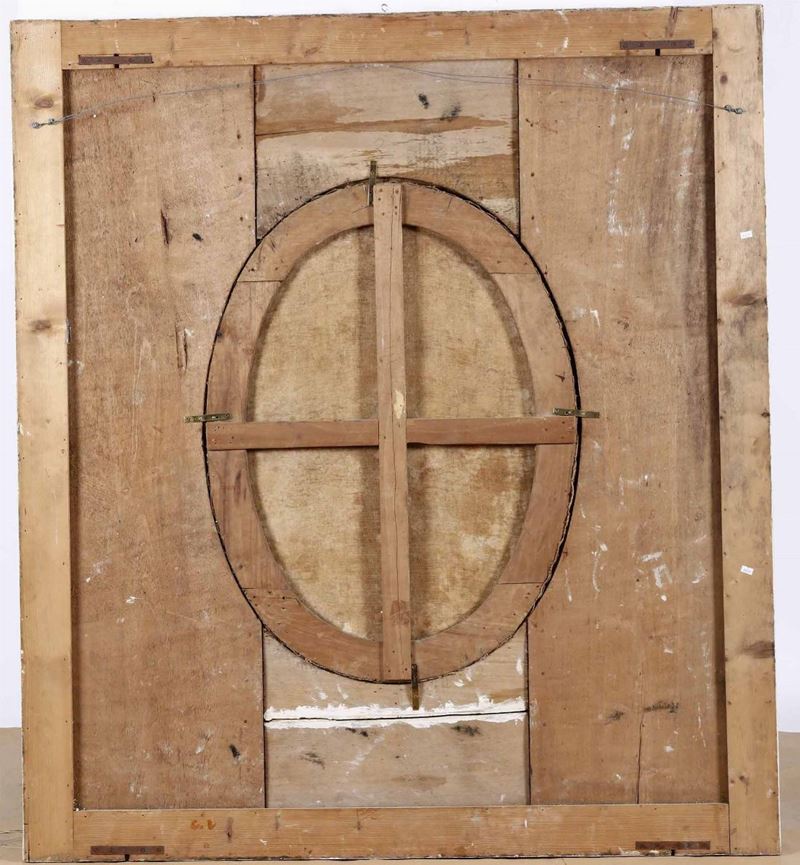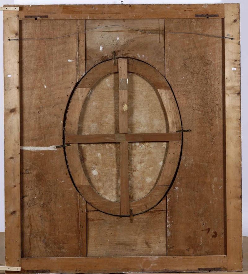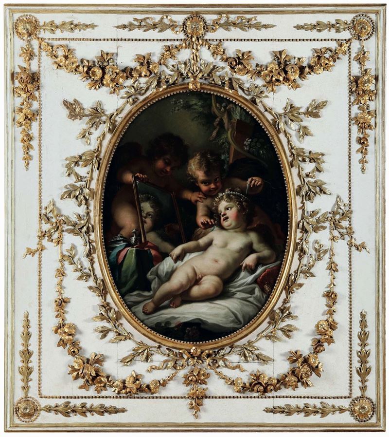 coppia di dipinti, in in cornici laccate e dorate con ghirlande floreali a rilievo