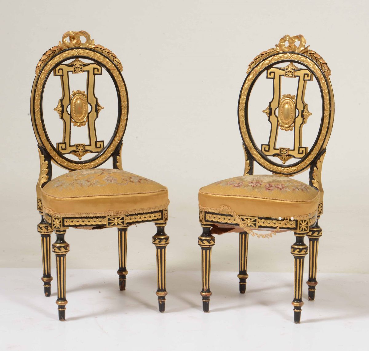 Coppia di sedie Napoleone III in legno intagliato, dorato ed ebanizzato. XIX secolo