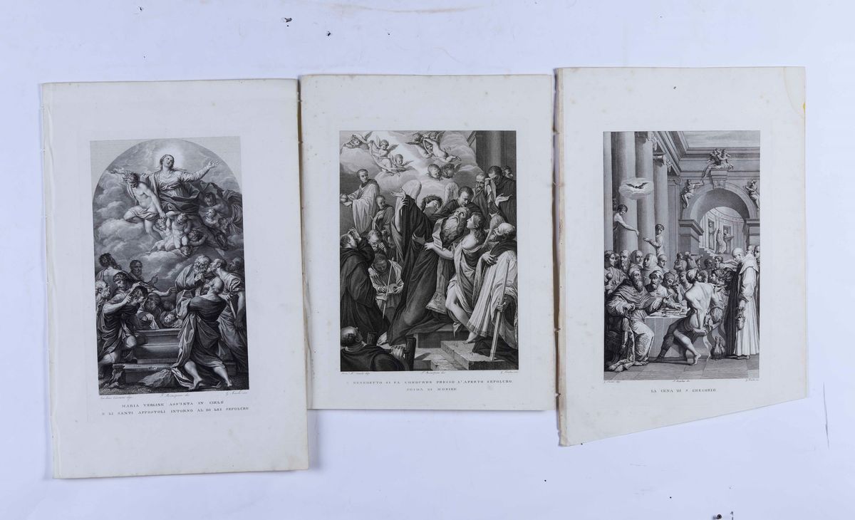 Lotto di tre incisioni: San Benedetto, La cena di S. Gregorio, Maria Vergine assunta in cielo