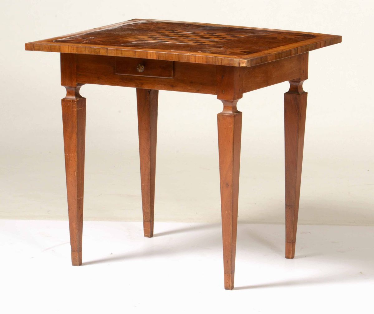 Piano intarsiato a scacchiera, un cassetto nella fascia