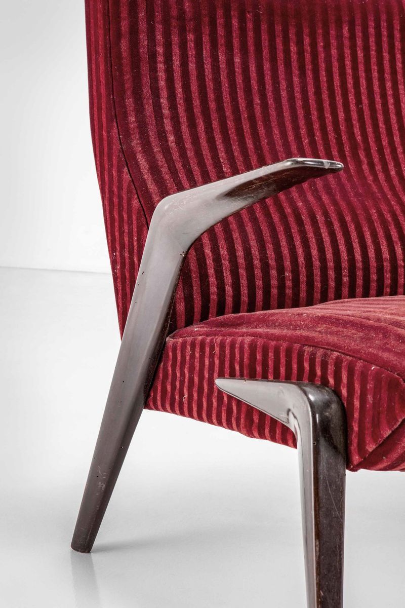 Struttura in legno, sostegni e braccioli in legno modellato e rivestimenti in tessuto.