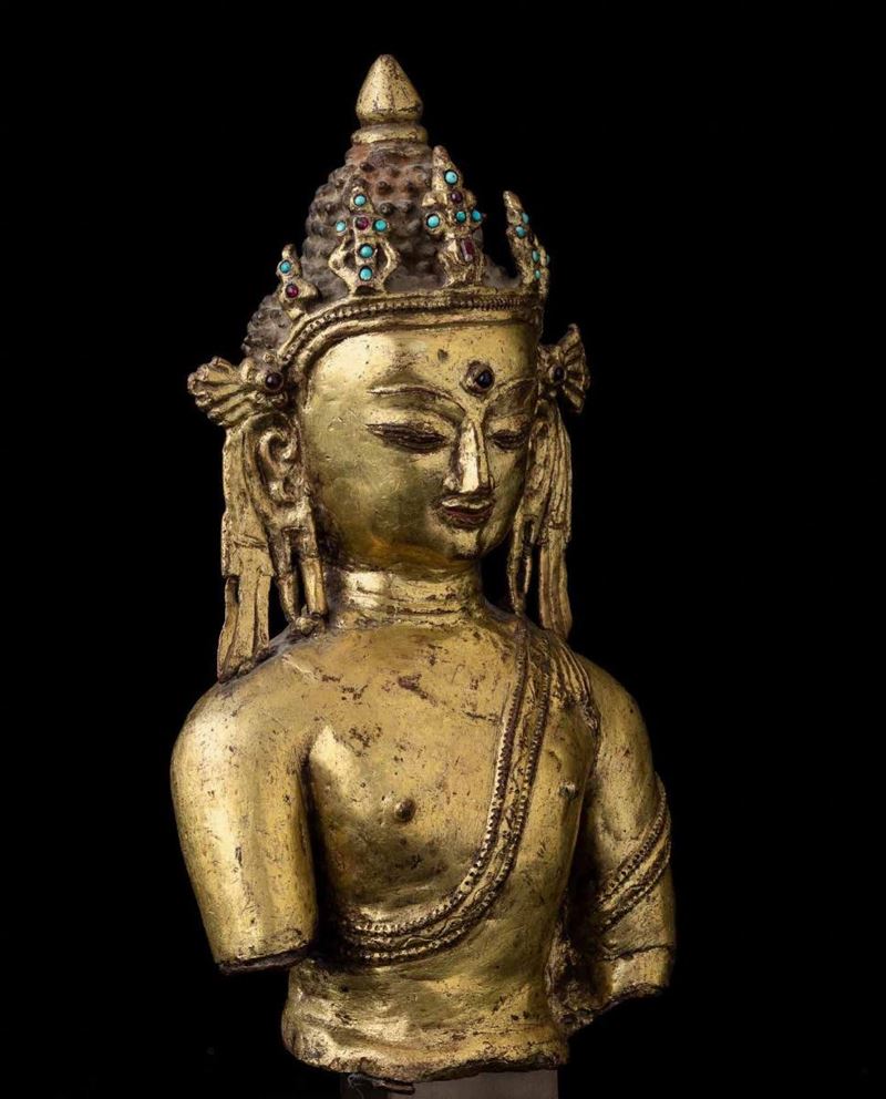 A gilt bronze Buddha bust, Tibet, 1600s