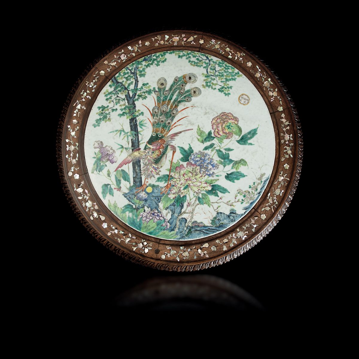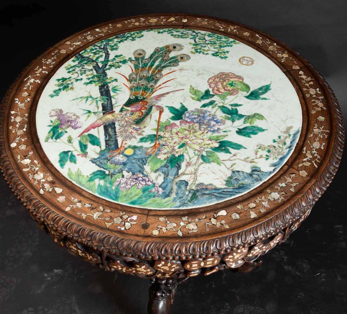 Wood with mother-of-pearl inlays and a Famille Rose porcelain plaque on the tabletop