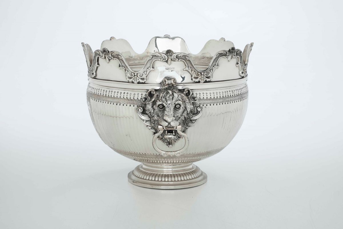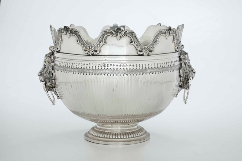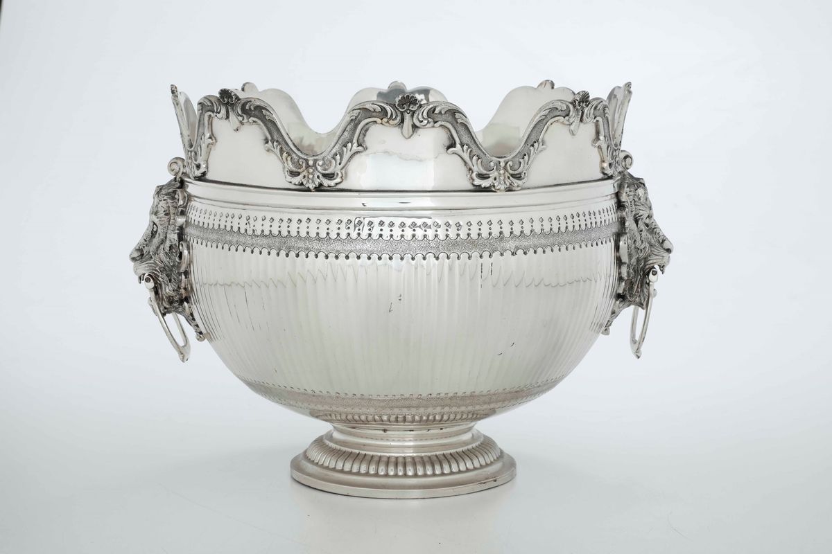 Elegante modello inglese con ansa laterali con teste di leone anellate. Bordo smerlato decorato con motivi vegetali e conchiglie; corpo centrato da riserva ovale a specchio e piede circolare baccellato