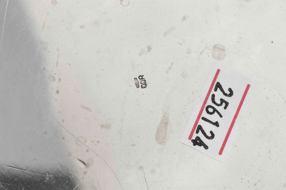 Centrotavola in argento fuso, sbalzato e cesellato. Argenteria italiana del XX secolo. Bollo con fascio littorio in uso dal 1935 al 1945. Bollo dell'argentiere consunto