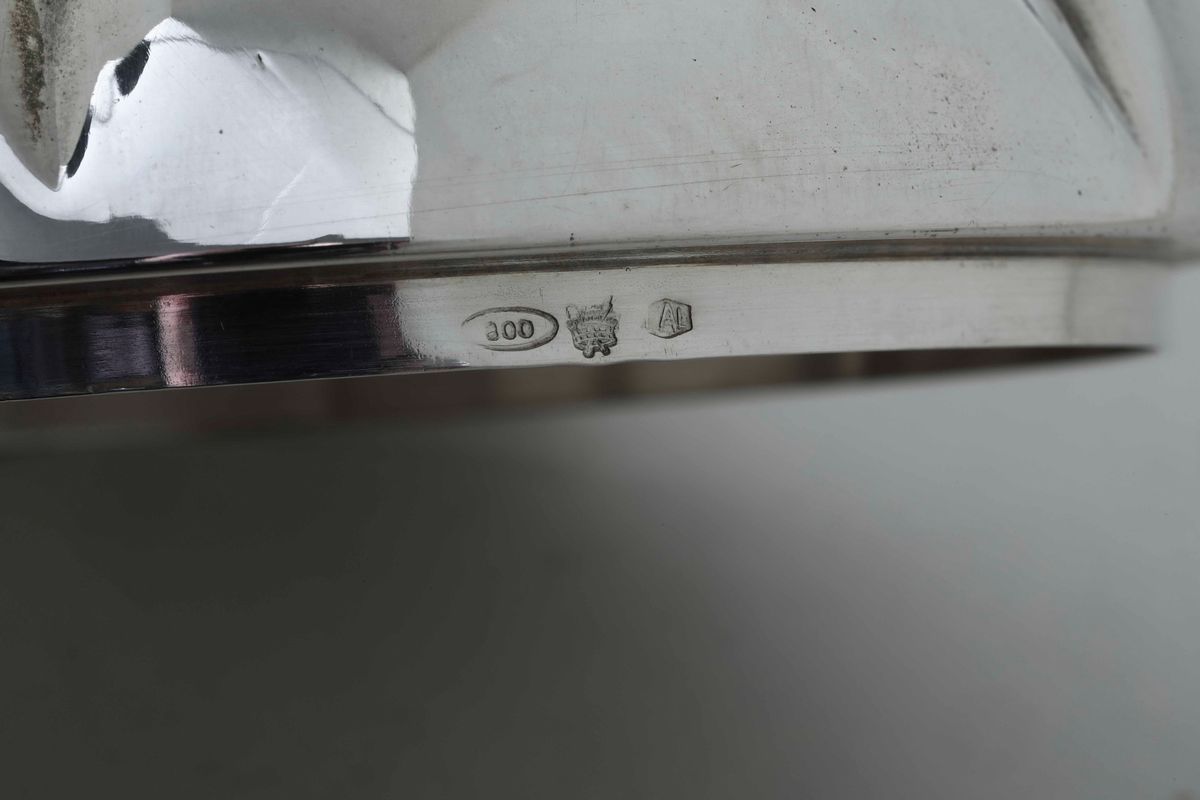 Compostiera a forma di pomodoro in argento e vetro. Argenteria italiana del XX secolo, argentiere Cesa, Alessandria